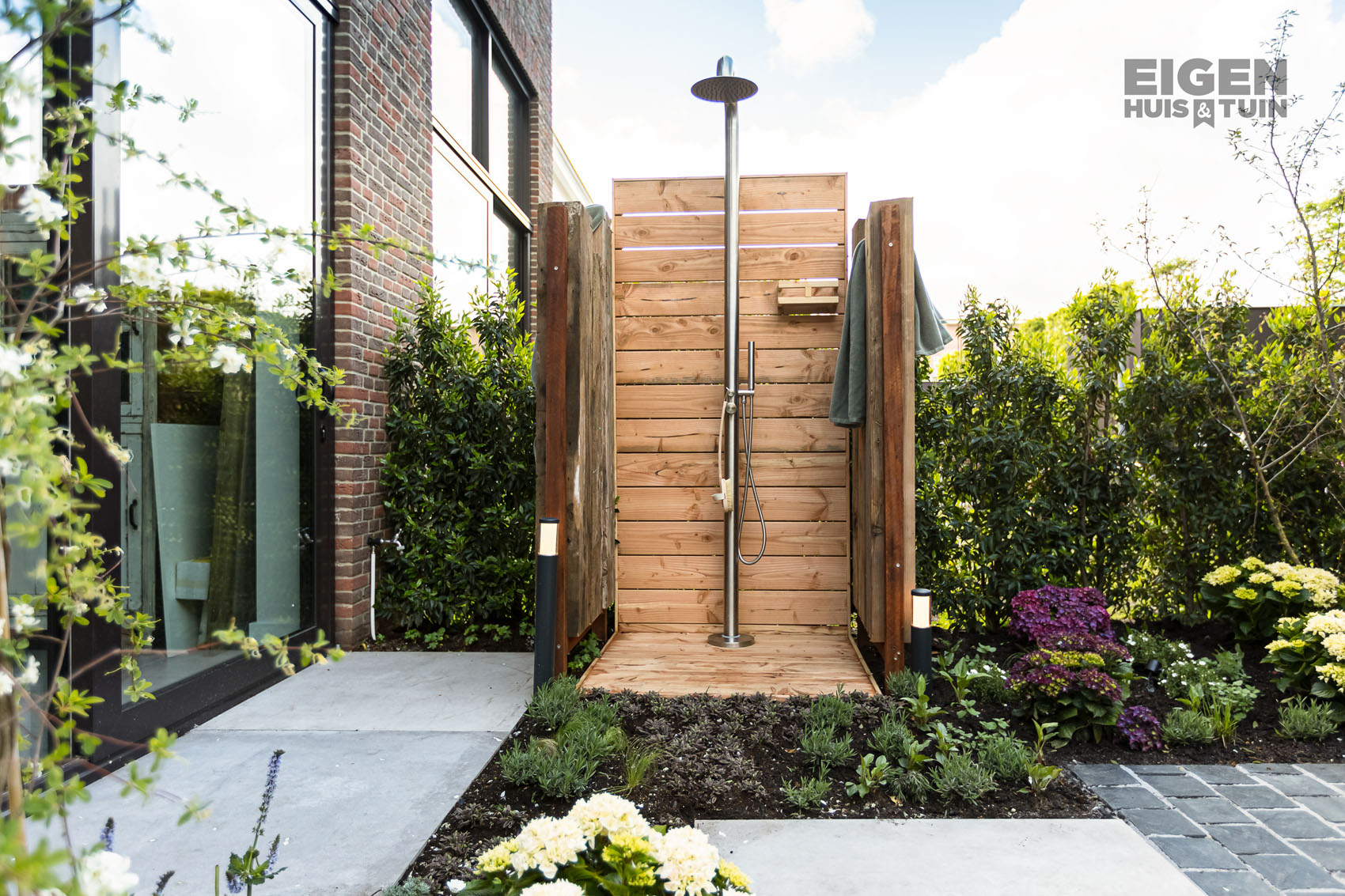 Om een strandgevoel te creëren, zijn twee soorten tegels gebruikt: grote GeoCeramica® Brooklyn Gris tegels van 100x100cm en kleinere Rustic Belgian Blue stenen. De combinatie van lichtgrijs en bruintinten geeft een warm en speels effect dat perfect past bij de omgeving. Voor gezinnen die dicht bij de kust wonen, zoals Heleen en Stefan met hun drie kinderen, mag een buitendouche niet ontbreken voor een verfrissende spoeling na een dagje strand.