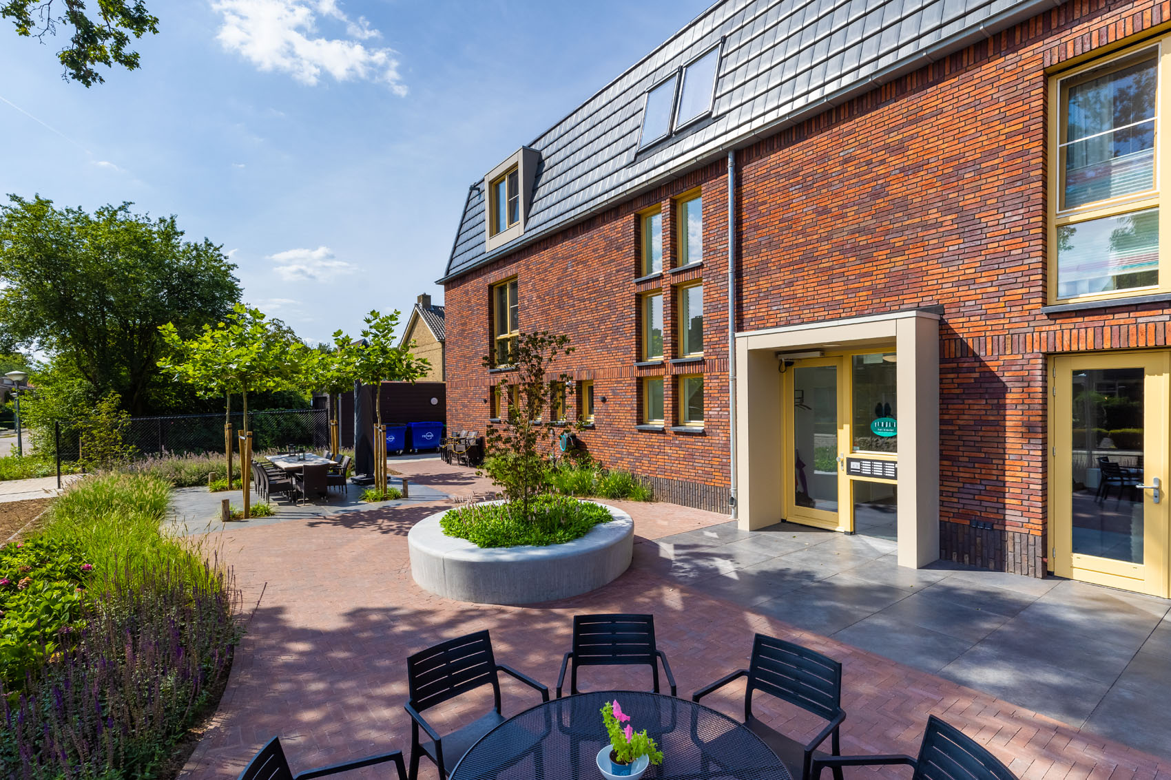 En plus du complexe résidentiel et de soins, un jardin commun a également été créé. Après la construction du bâtiment, il n'y avait presque plus de budget pour le jardin. Grâce à l'aide de bénévoles et de sponsors, dont MBI pour le pavage, un magnifique jardin a été aménagé, qui est rapidement devenu un lieu de rencontre préféré. Marco van Deursen, parent et leader du groupe de jardinage, a pris contact avec MBI lorsqu'il a rencontré son collègue Prince Carnaval Robert van der Meijden. MBI a volontiers soutenu l'aménagement du jardin en faisant un don de tous les matériaux de pavage nécessaires.