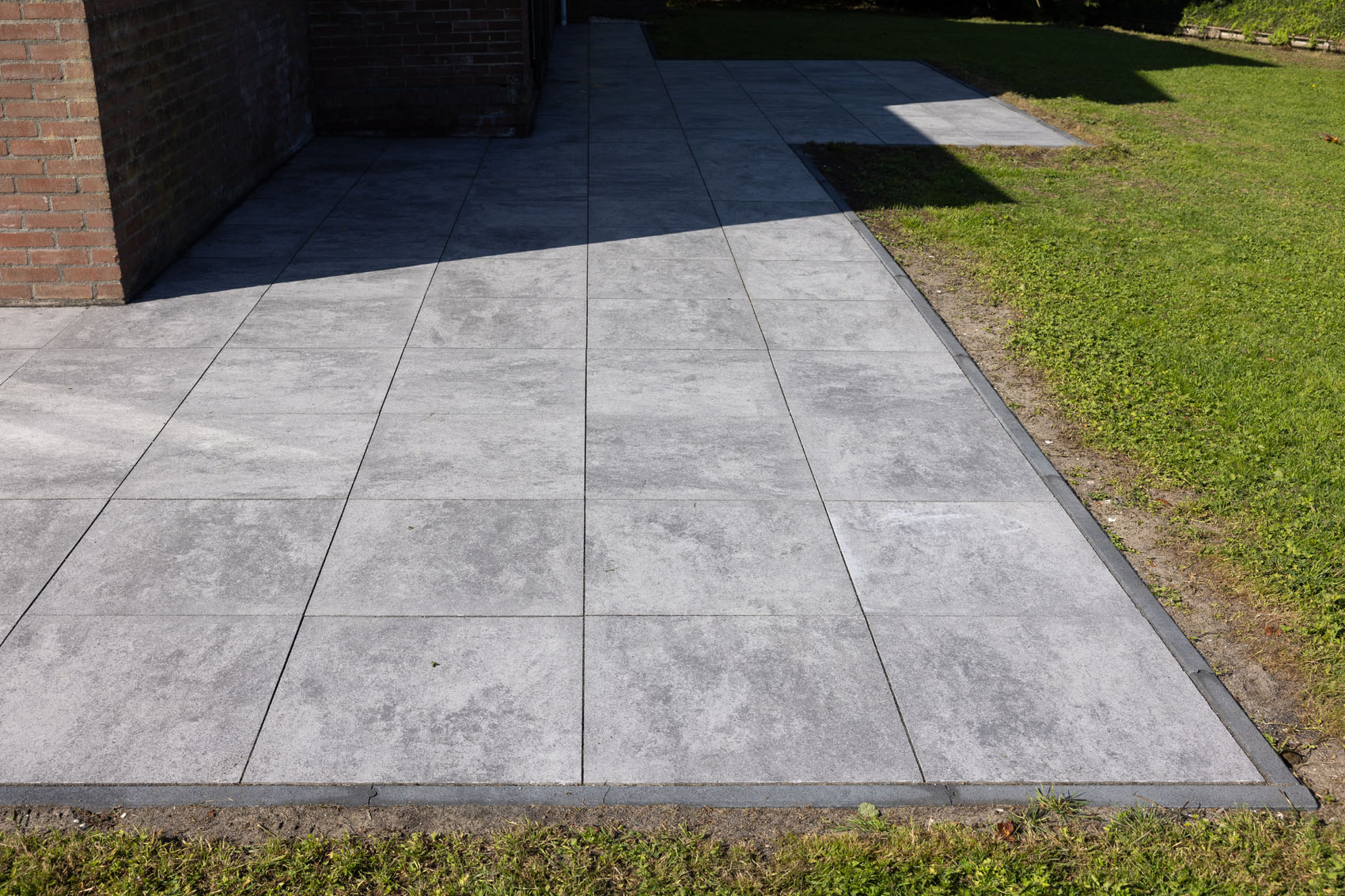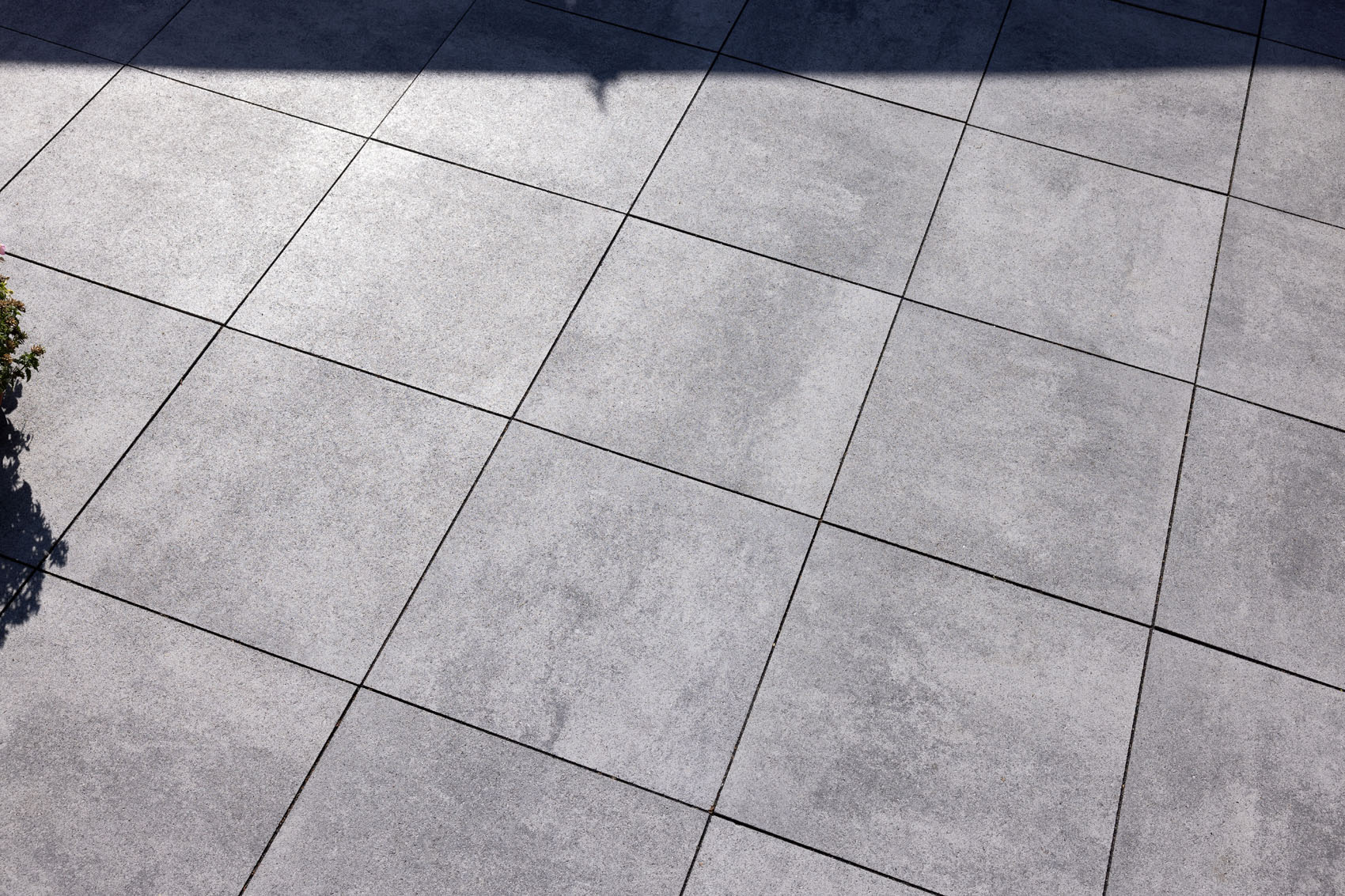 Les dalles GeoCorso sont disponibles en différents formats. Ici, le format 60 x 60 x 4 cm a été choisi. La grande surface de la dalle et les joints foncés confèrent au jardin un aspect épuré et spacieux. Pour les allées, il existe également une variante 2Drive de 6 cm d'épaisseur. Celle-ci permet de prolonger la terrasse jusqu'à l'allée pour créer un ensemble cohérent.