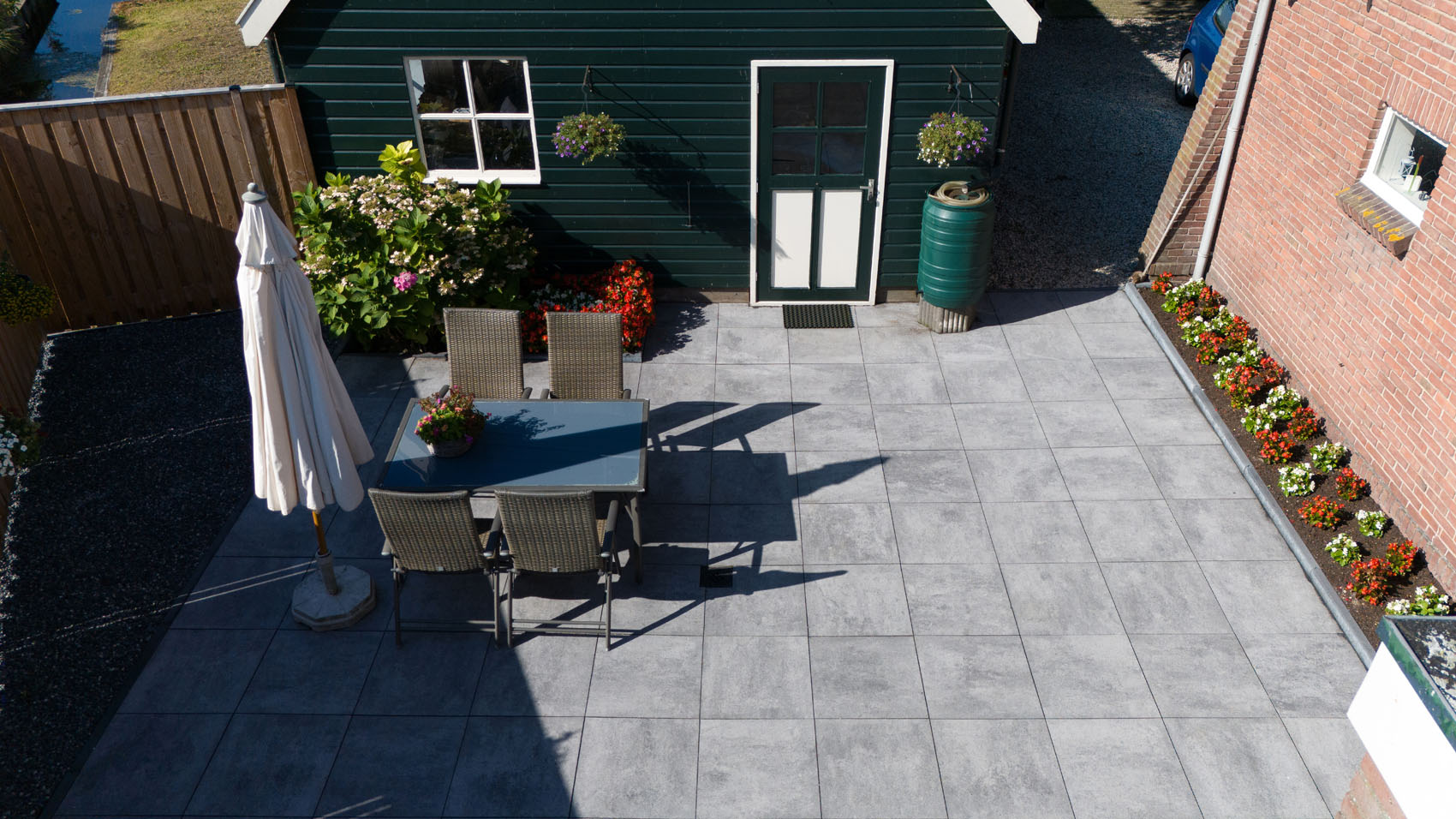 Outre la conservation de la couleur pendant de nombreuses années, cette protection rend la terrasse plus résistante à la saleté et à la pollution. Dans ce jardin verdoyant, la protection empêche les feuilles et la terre de laisser des taches permanentes. Un simple nettoyage suffit pour redonner tout son éclat à la terrasse. Le GeoCorso est donc plus facile à entretenir que les dalles en béton traditionnelles.