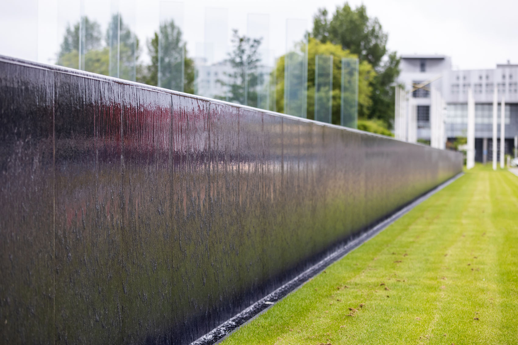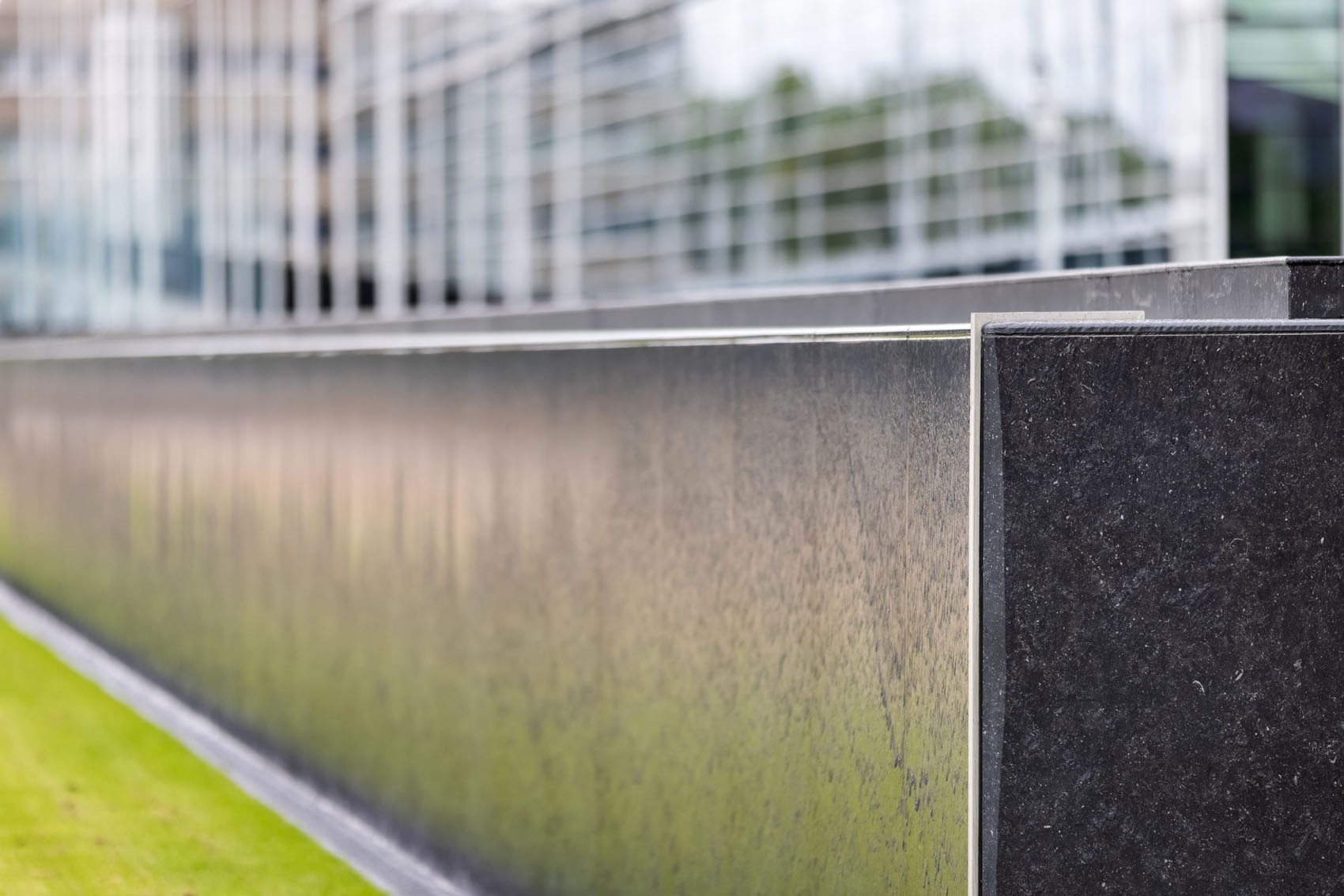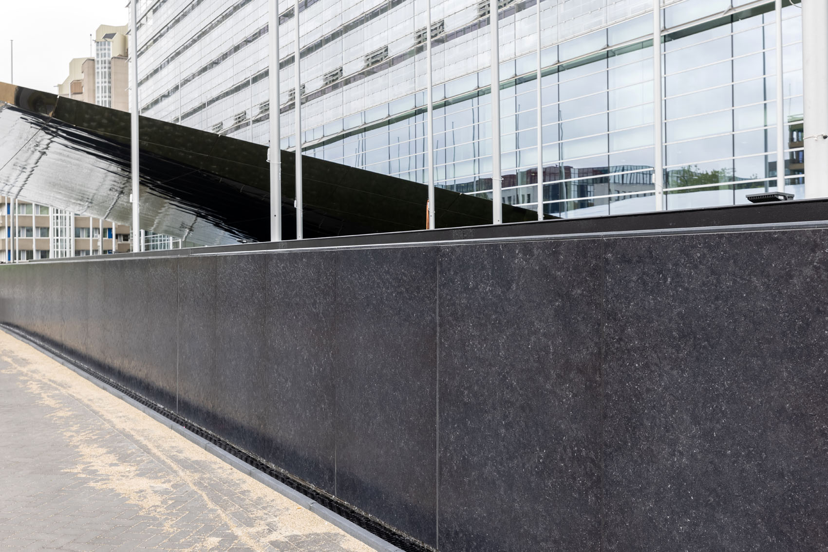 Voor de horizontale deel van de waterval zijn maatwerk afdekkers geproduceerd door Mirage. Deze zijn kwartrond afgewerkt en licht hellend geplaatst zodat het water overheen ‘loopt’ en niet valt. Ook bij de afdekkers was continuïteit van groot belang. De slabs werden als uitgangspunt gebruikt voor de afdekkers, waardoor kleur en textuur perfect aansloten bij de rest. De maatvoering moest ook perfect aansluiten zodat het lijnenspel van de ramen, tegels en slabs doorloopt. Net als bij de slabs zijn ook voor de verwerking van deze tegels speciale primers, mortellagen en lijmen toegepast. Ook hiervoor geldt dat dit werk alleen uitgevoerd kan worden door de absolute specialisten.