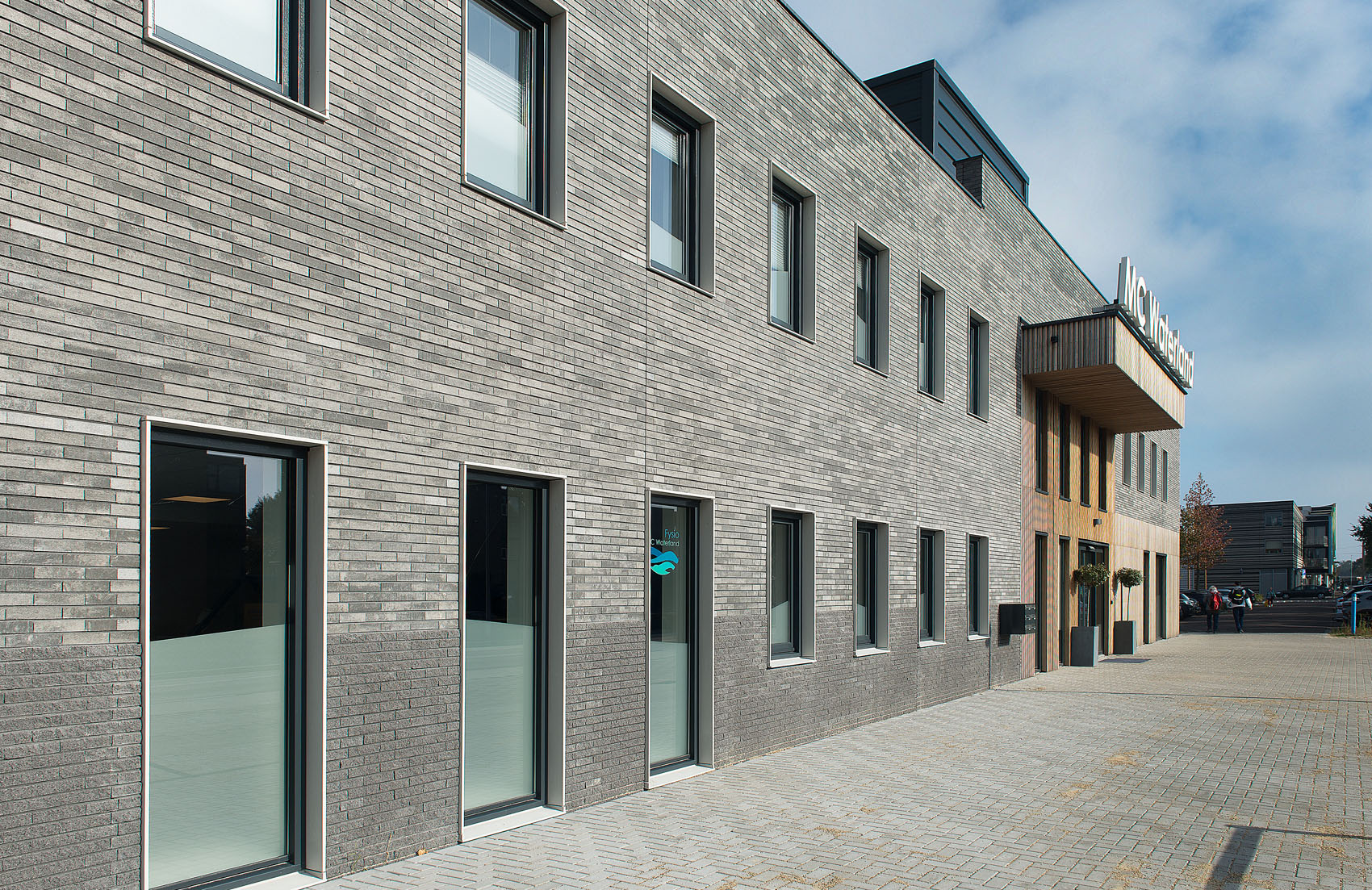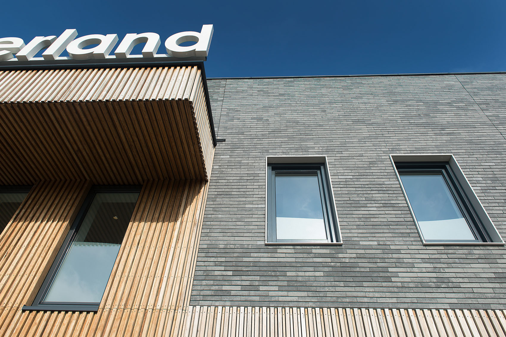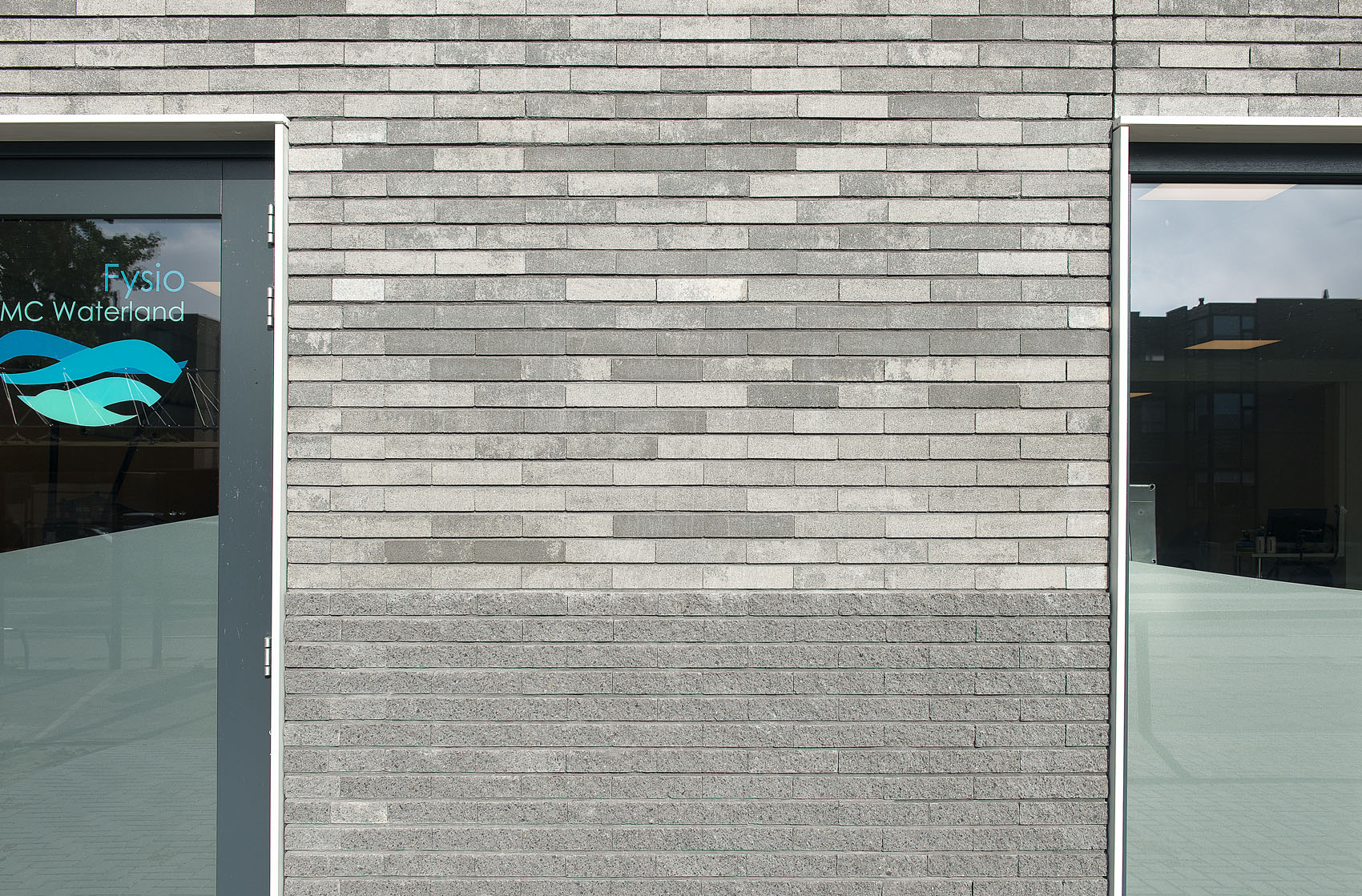 De voorzijde van het MC Waterland is bekleed met GeoStylistix Shaded Grey in waalformaat, gecombineerd met een donkergrijze breuksteenplint en verticale houten platen. Deze samenstelling brengt de kenmerkende elementen van het water en het woud van de polder van Zeewolde tot leven in het gebouw. De stenen zijn stootvoegloos gemetseld met donkere doorstrijkmortel, wat het gewenste horizontale karakter in de gevels versterkt.