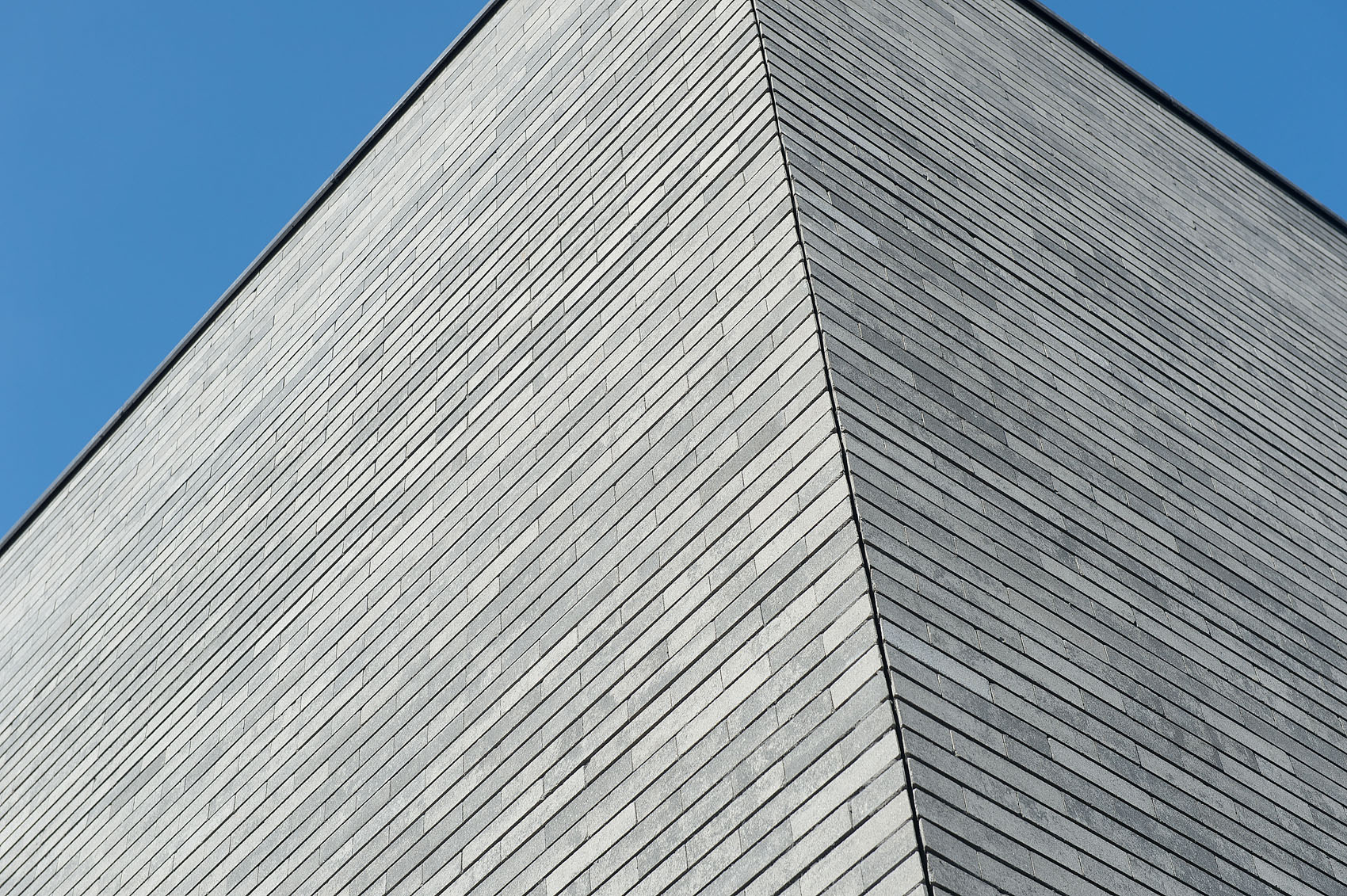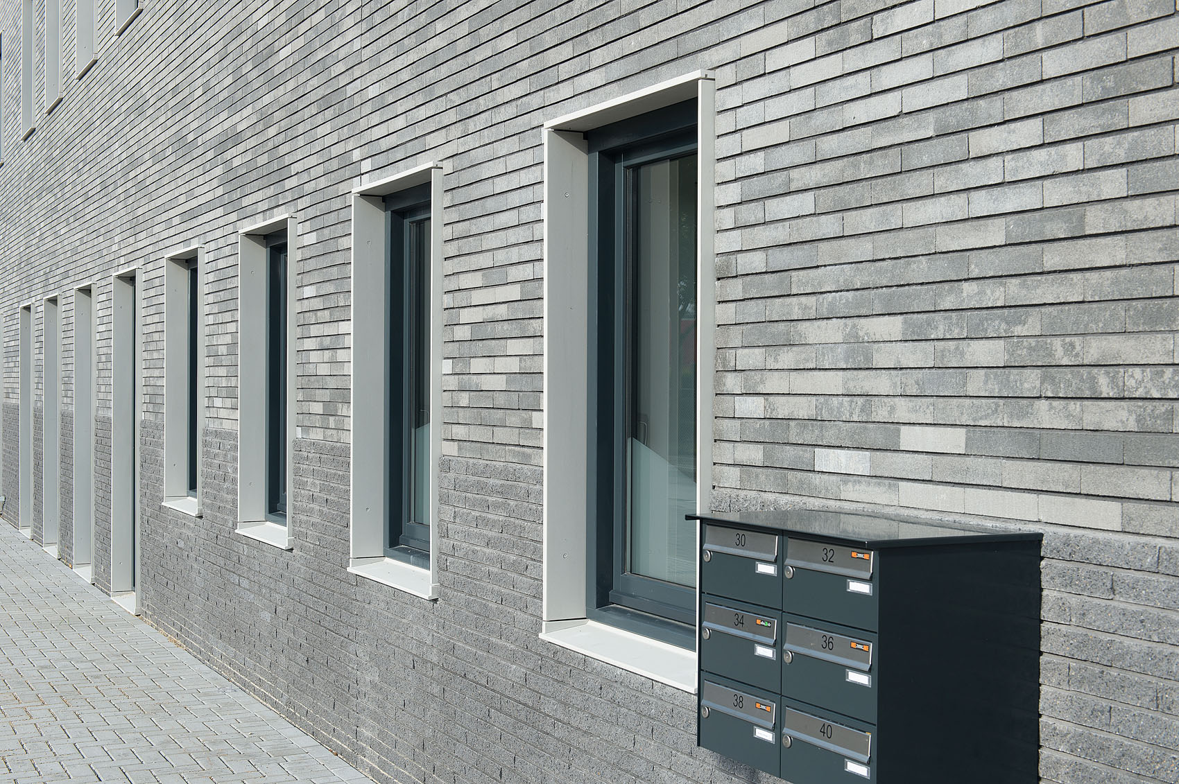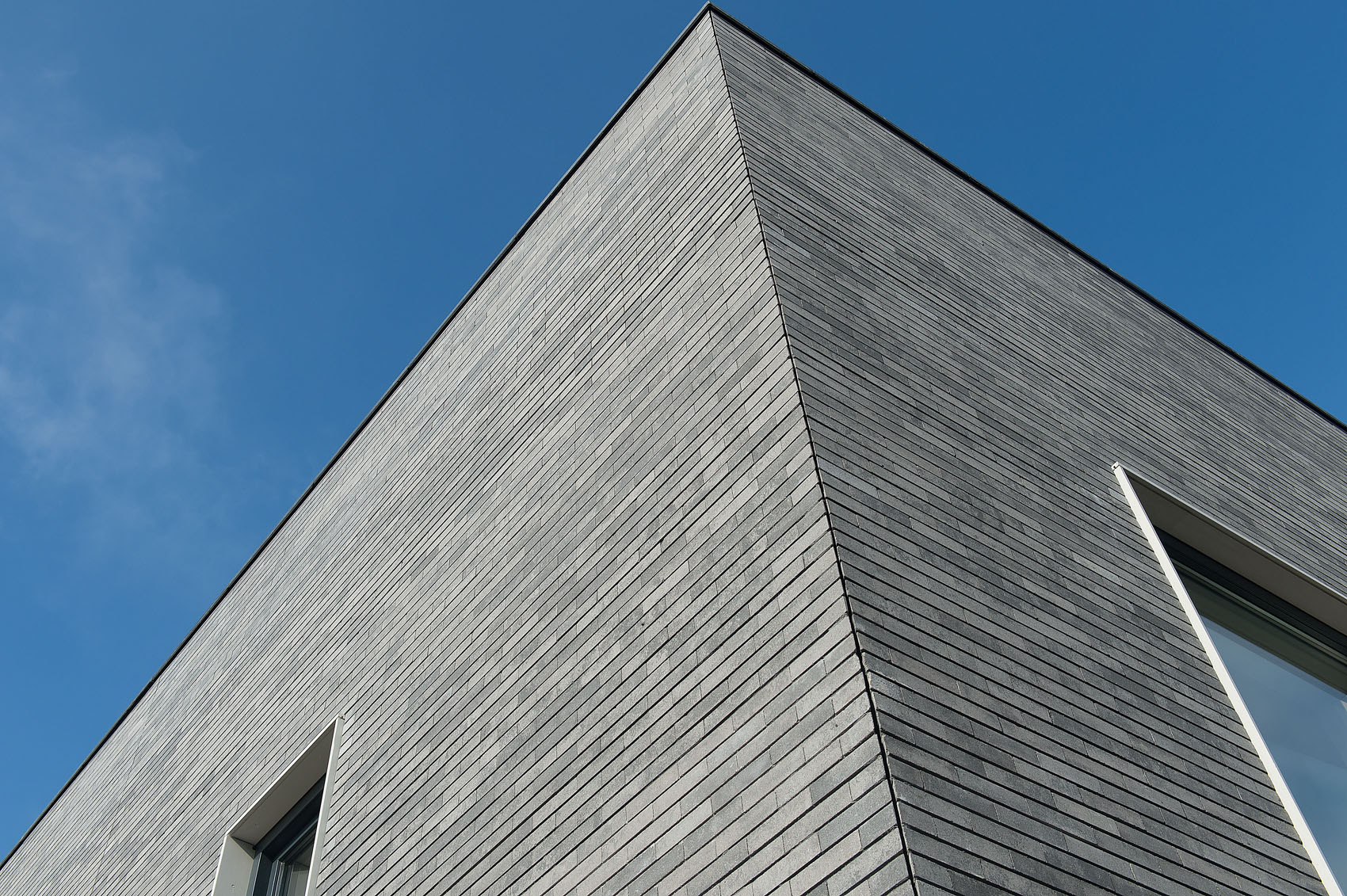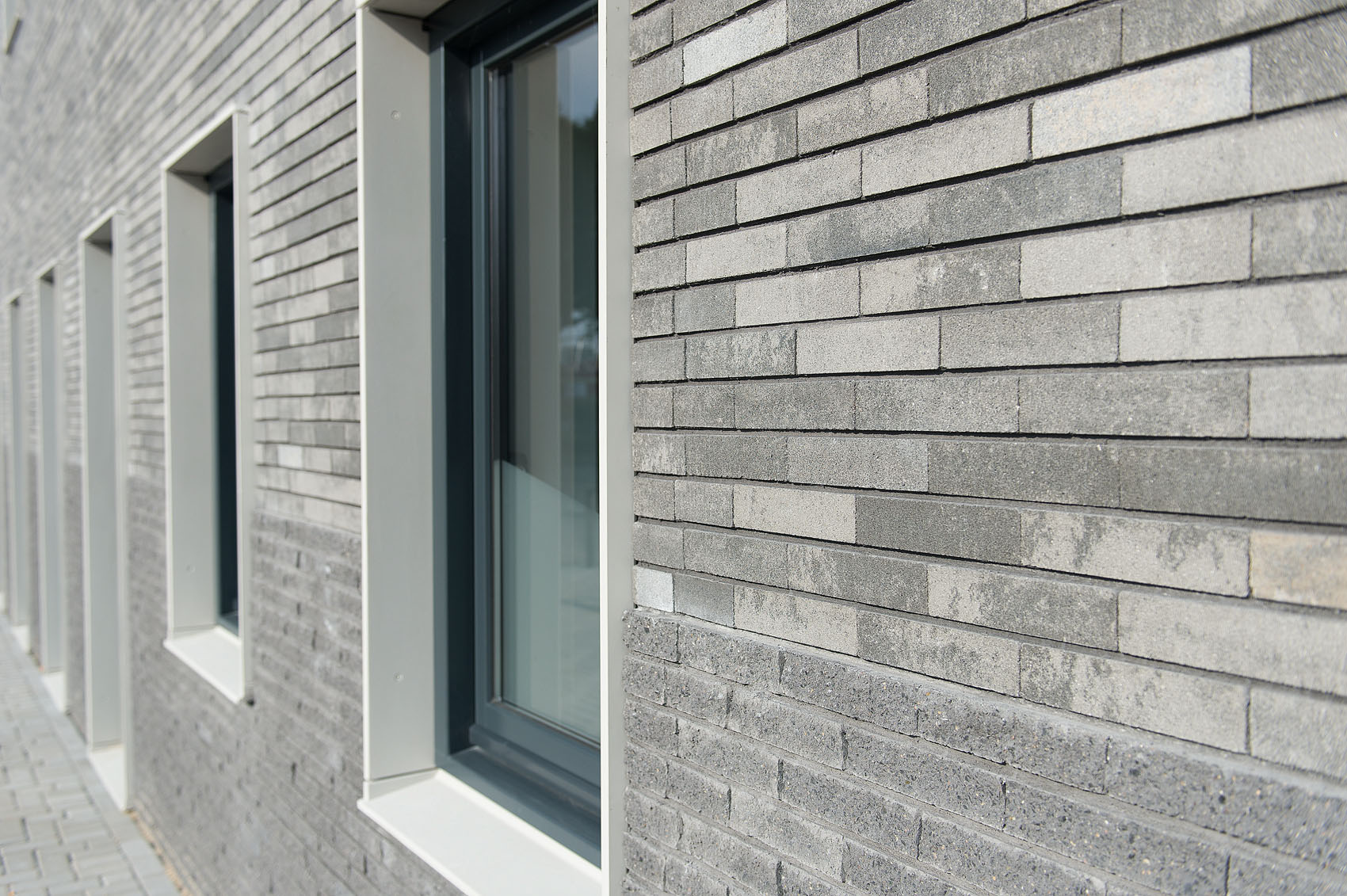 De voorzijde van het MC Waterland is bekleed met GeoStylistix Shaded Grey in waalformaat, gecombineerd met een donkergrijze breuksteenplint en verticale houten platen. Deze samenstelling brengt de kenmerkende elementen van het water en het woud van de polder van Zeewolde tot leven in het gebouw. De stenen zijn stootvoegloos gemetseld met donkere doorstrijkmortel, wat het gewenste horizontale karakter in de gevels versterkt.