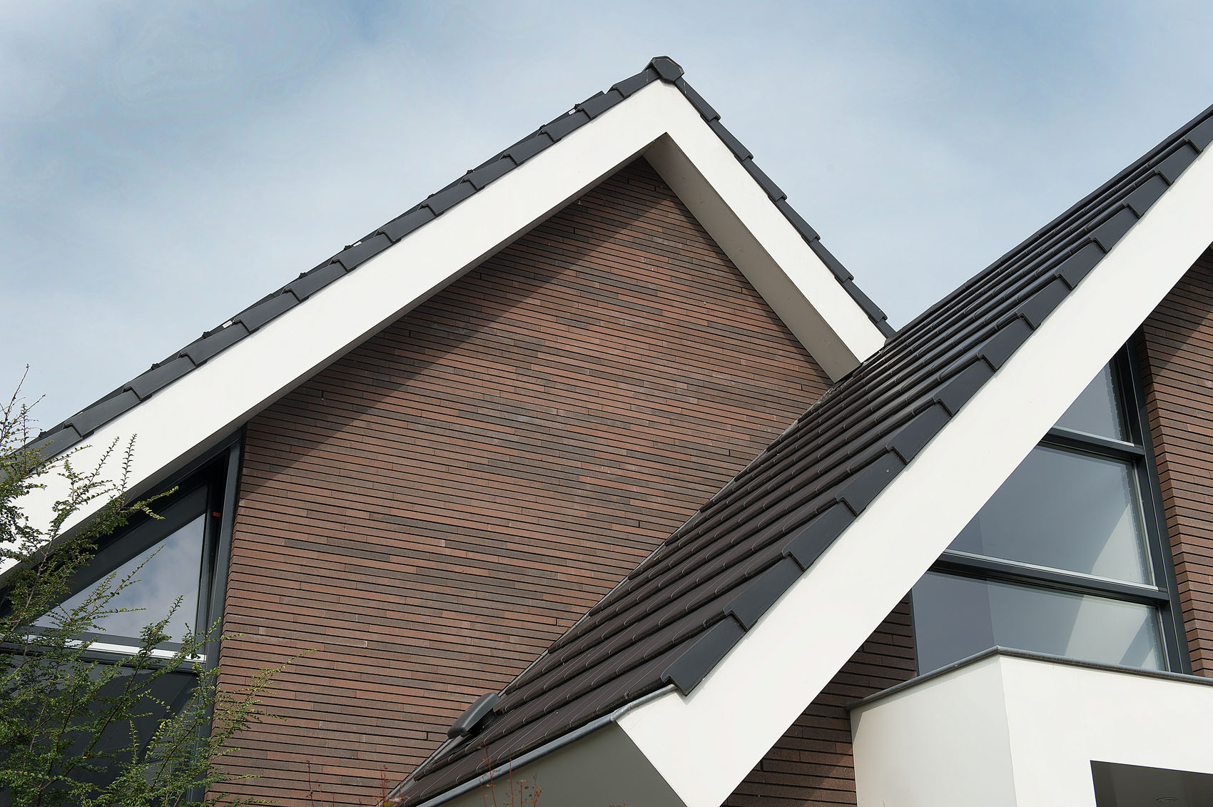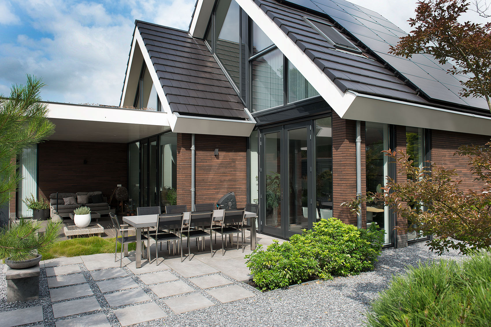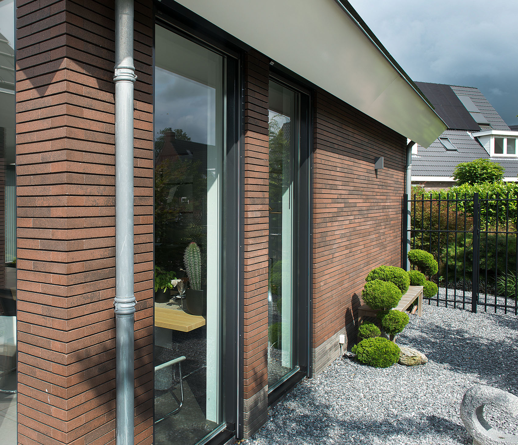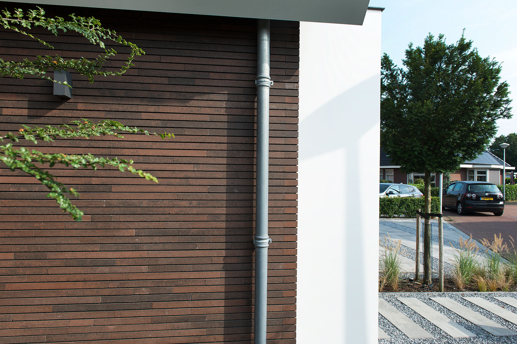 De bewoners van de villa in Benthuizen hebben gekozen voor de lange, slanke gevelsteen GeoStylistix. Deze moderne, kleurvaste steen geeft de gevel een bijzondere uitstraling. Door het bijzondere formaat is een uniek lijnenspel te creëren. Ook is de steen heel mooi te combineren met andere materialen, zoals aluminium, glas en hout. In Benthuizen is bijvoorbeeld gekozen voor houten kozijnen en grote raampartijen. De bewoners hebben bovendien gekozen voor een combinatie van twee kleuren GeoStylistix. De Shaded Brown Black zorgt voor een warme uitstraling en de Shaded Grey is toegepast voor accent en mooie overgang met de buitenruimte.