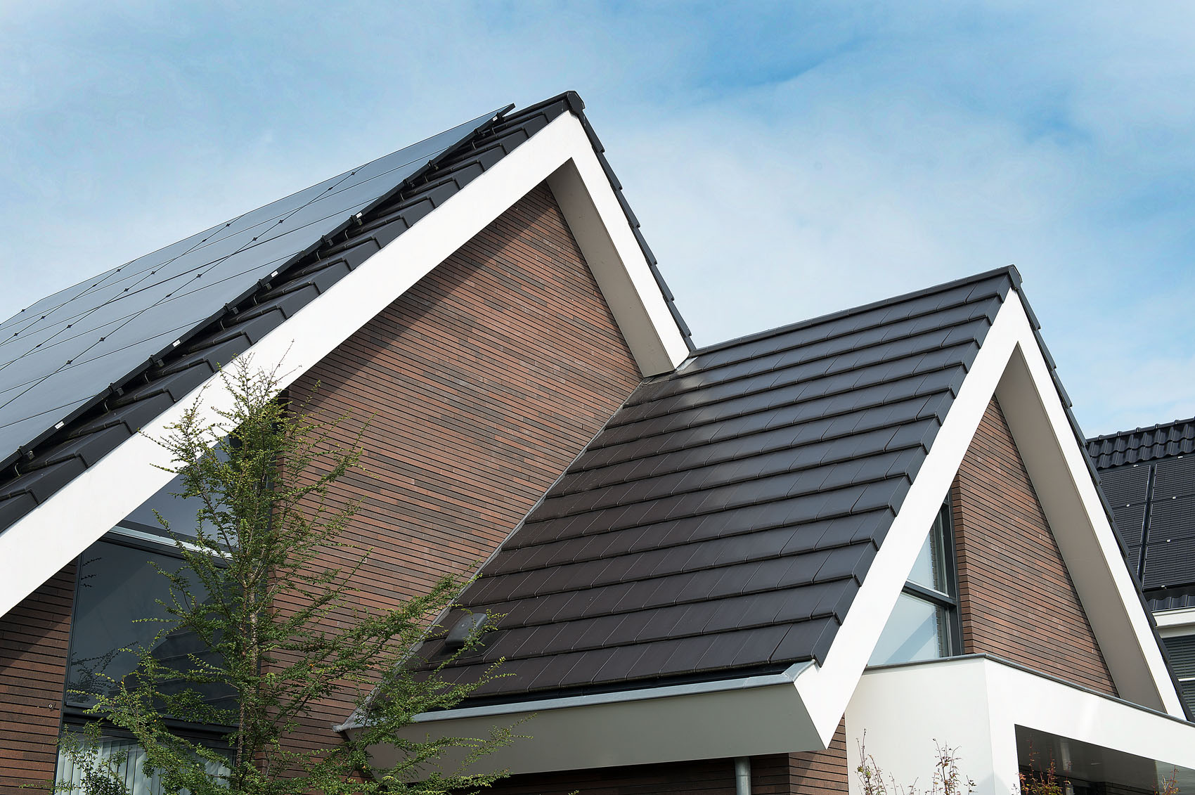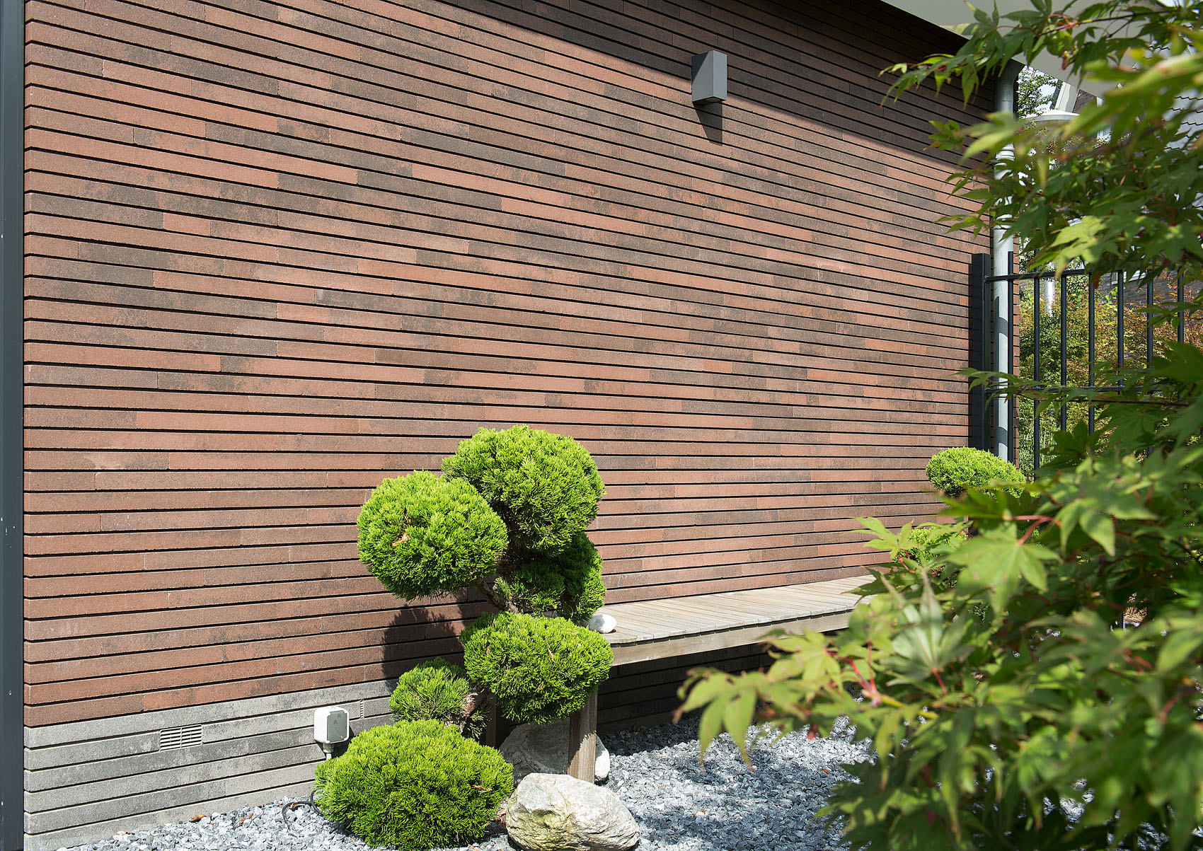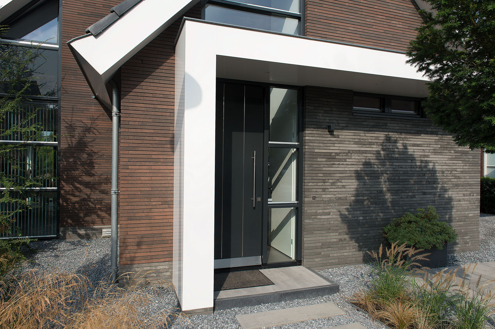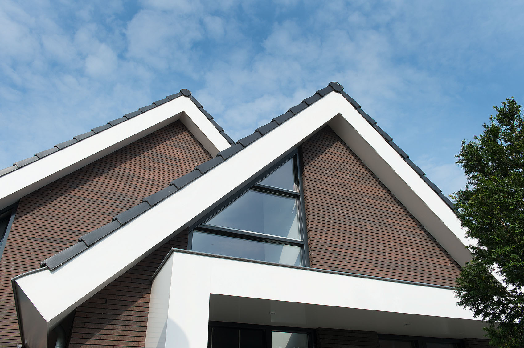 De bewoners van de villa in Benthuizen hebben gekozen voor de lange, slanke gevelsteen GeoStylistix. Deze moderne, kleurvaste steen geeft de gevel een bijzondere uitstraling. Door het bijzondere formaat is een uniek lijnenspel te creëren. Ook is de steen heel mooi te combineren met andere materialen, zoals aluminium, glas en hout. In Benthuizen is bijvoorbeeld gekozen voor houten kozijnen en grote raampartijen. De bewoners hebben bovendien gekozen voor een combinatie van twee kleuren GeoStylistix. De Shaded Brown Black zorgt voor een warme uitstraling en de Shaded Grey is toegepast voor accent en mooie overgang met de buitenruimte.