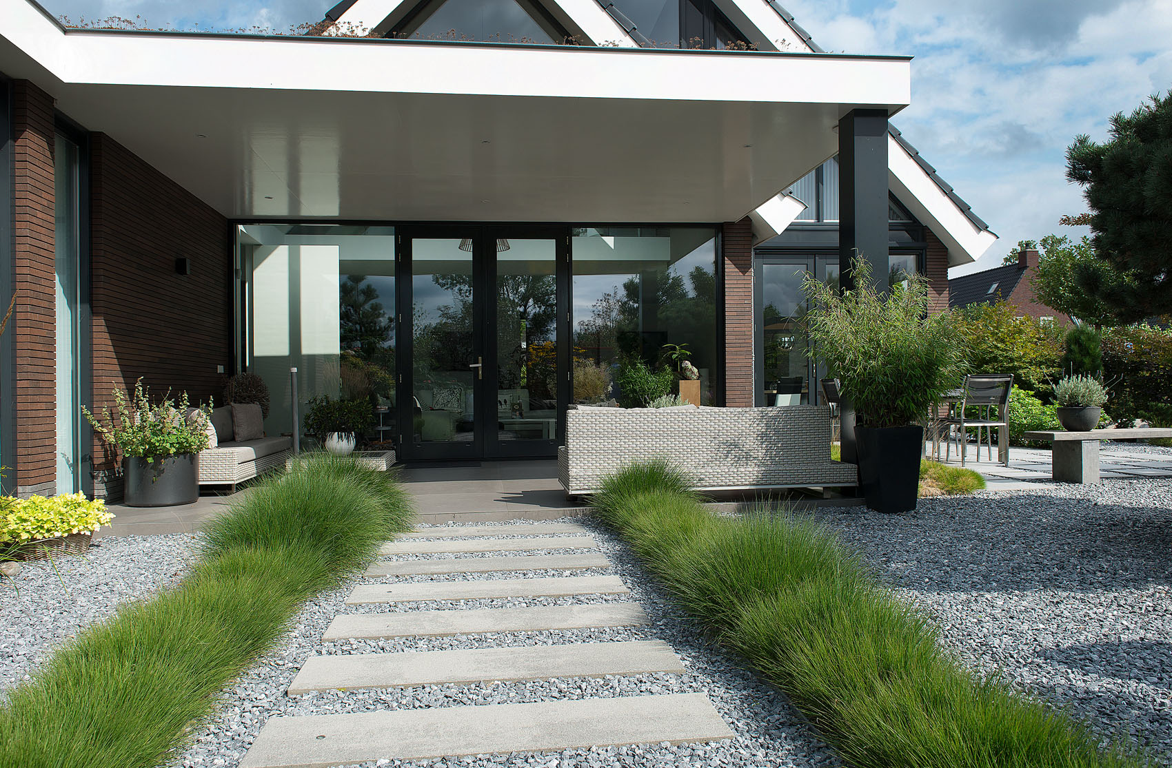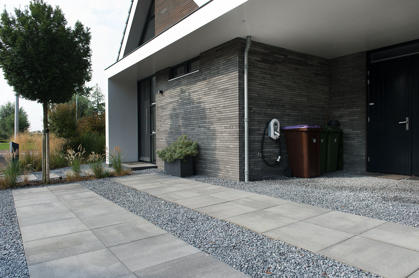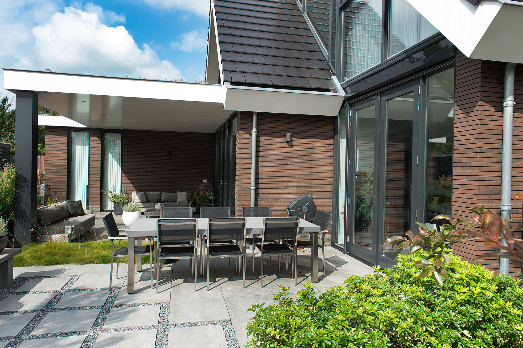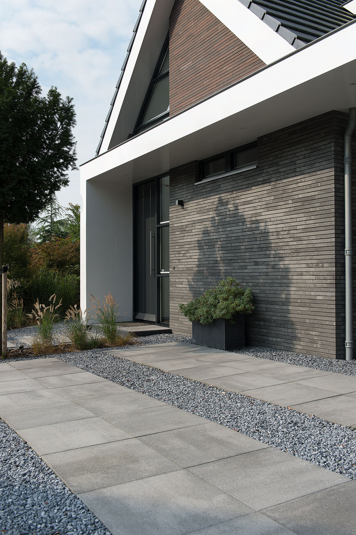 Keramische buitentegels bepalen, net als de gevel, voor een groot gedeelte de sfeer van de buitenruimte rondom de woning. Bij de villa in Benthuizen is een combinatie gebruikt van GeoSteen® en GeoCeramica®. Door het gebruik van hoogwaardige tegels zullen de bewoners jarenlang plezier hebben van een prachtige tuin. Zo zijn de tegels onder andere zeer kleurvast en onderhoudsarm. De inrichting van de buitenruimte is modern en speels met o.a. stapstenen en halverharding voor waterdoorlatendheid. De buitenruimte is daarmee zowel esthetisch als functioneel.