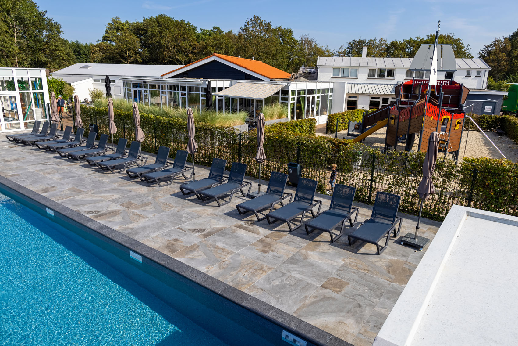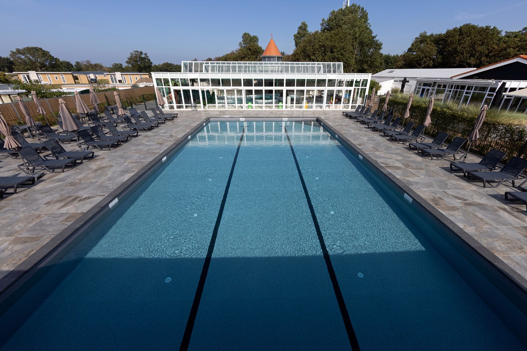 Om een gevoel van eenheid te creëren, heeft Camping Ginsterveld standaard zwembadranden in antraciet gekozen. Hoewel dit een uitstekende optie is, biedt MBI nog een stap verder met de GeoCeramica® Specials. Deze maatwerk elementen, zoals zwembadranden en traptreden, zijn volledig complementair aan de terrastegels en zorgen voor een naadloos ontwerp. Dit betekent dat er geen stijlbreuken zijn in materiaalsoorten en kleuren, wat resulteert in een harmonieuze en esthetisch aantrekkelijke buitenruimte.