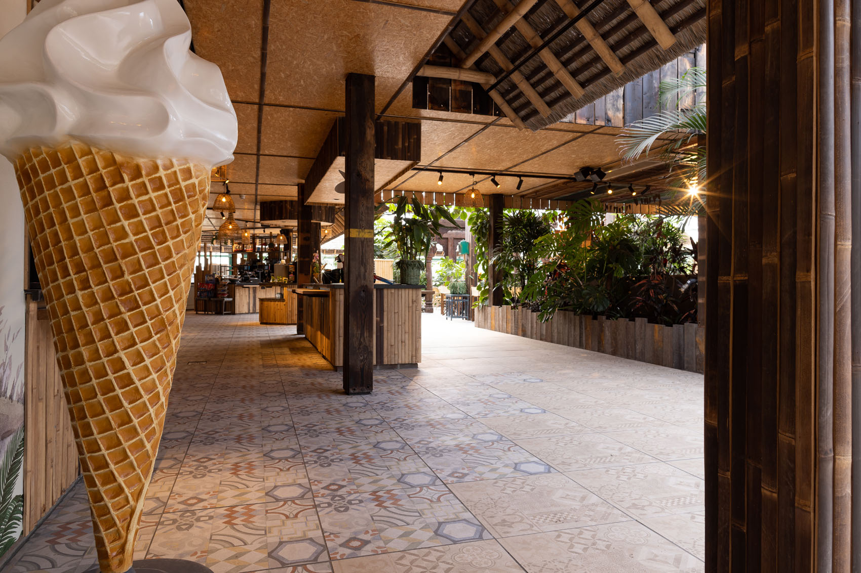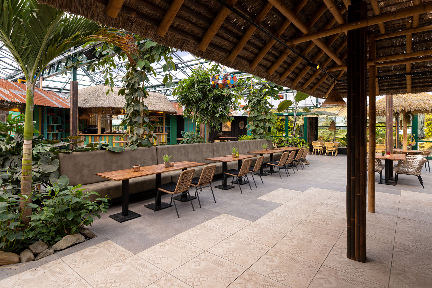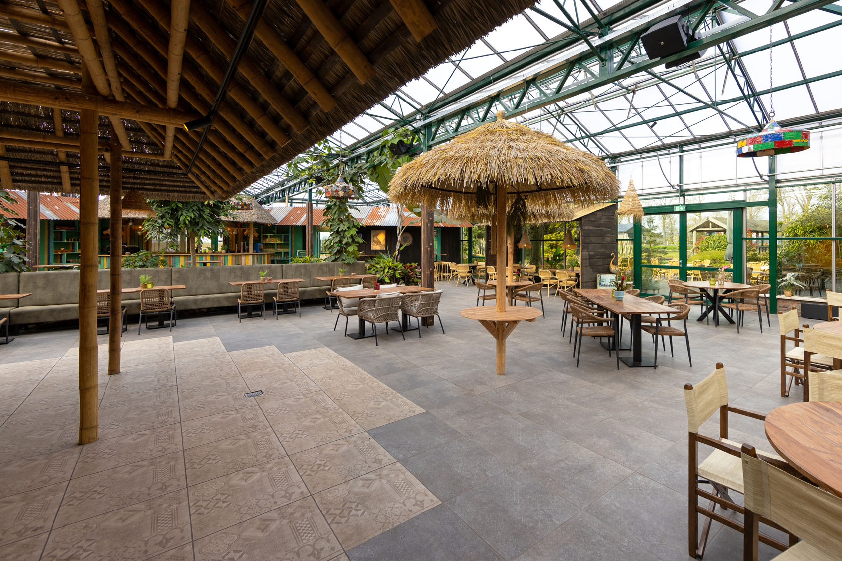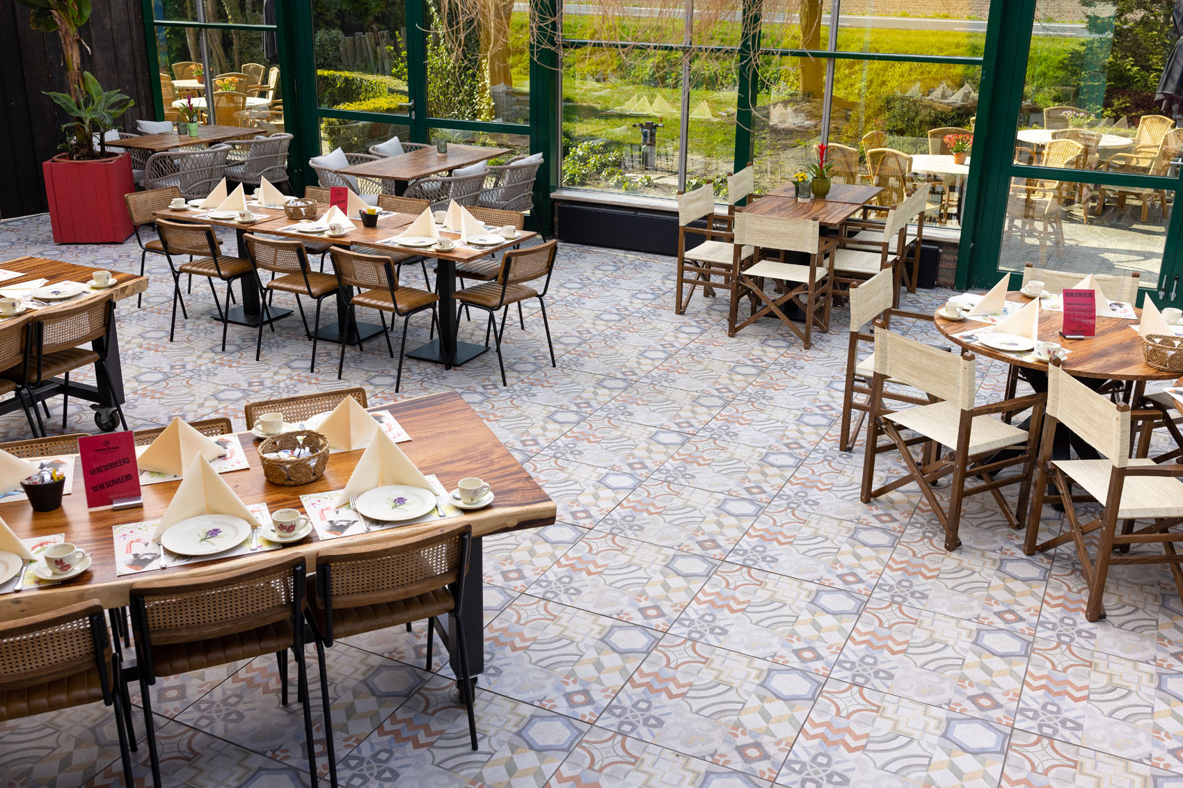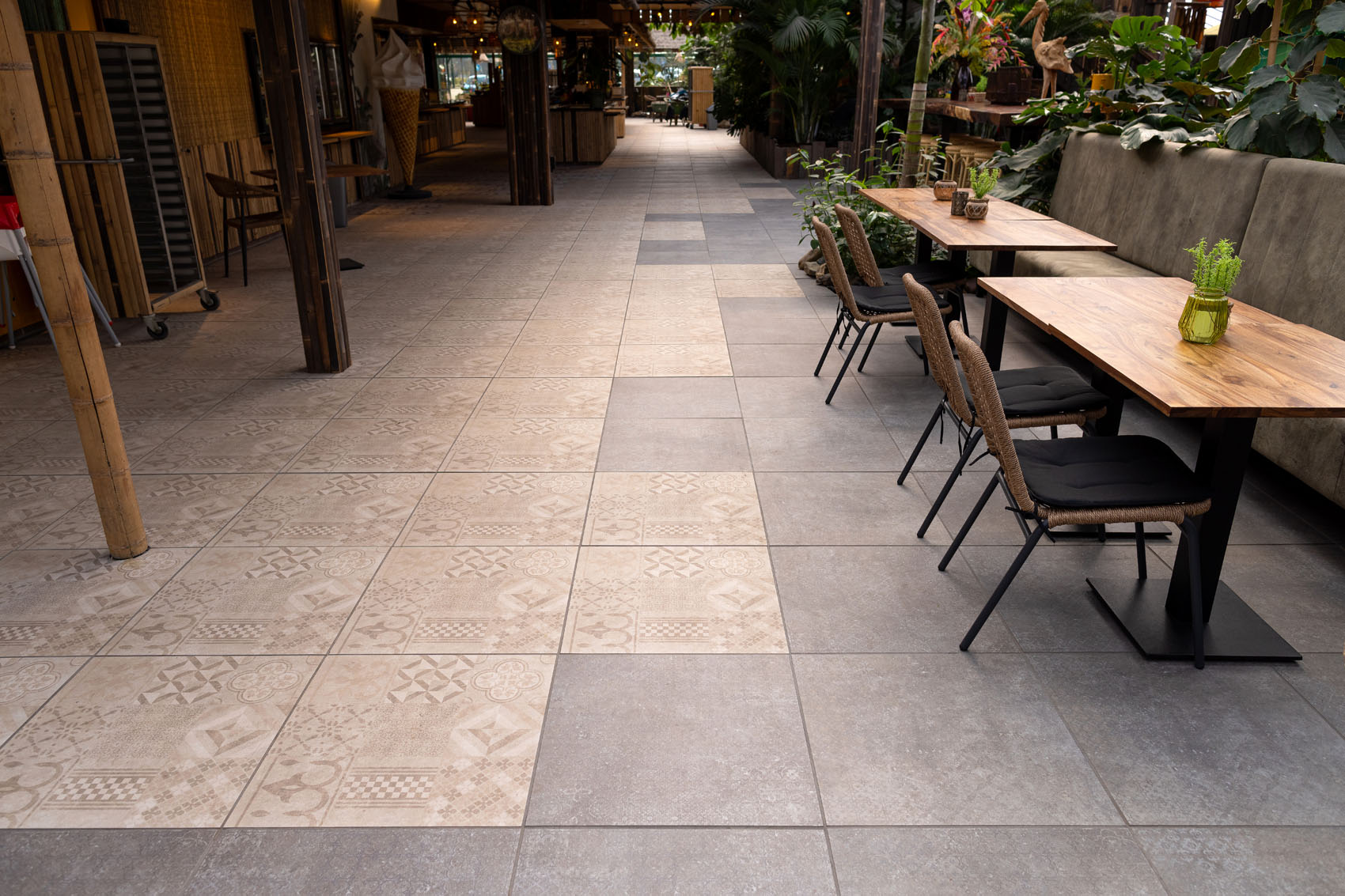 GeoCeramica® is een innovatieve tegel die de grenzen van traditionele vloerbekleding verlegt. Wat deze tegels bijzonder maakt, is hun veelzijdigheid; ze zijn geschikt voor zowel binnen- als buitentoepassingen. Deze eigenschap was essentieel voor de Orchideeënhoeve; de wens was dat de bezoekers een naadloze ervaring hebben terwijl ze van binnen naar buiten gaan en vice versa.