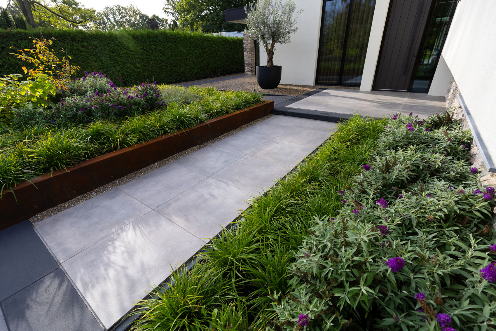 Zowel het terras als de entree liggen hoger dan de oprit. Om dit met elkaar te verbinden is er gekozen voor de Facetto traptrede in de kleur Milano. De strakke lijnen en hoogwaardige afwerking van deze traptrede geven elke tuin en oprit een luxe, moderne uitstraling. De Milano kleur sluit daarbij goed aan bij de donkere GeoKlinker Plus en lichte tuintegels. Naast esthetisch zijn deze traptreden ook onderhoudsarm dankzij de duurzame betonkwaliteit. Zo zet de Facetto traptrede de puntjes op de ‘i’.