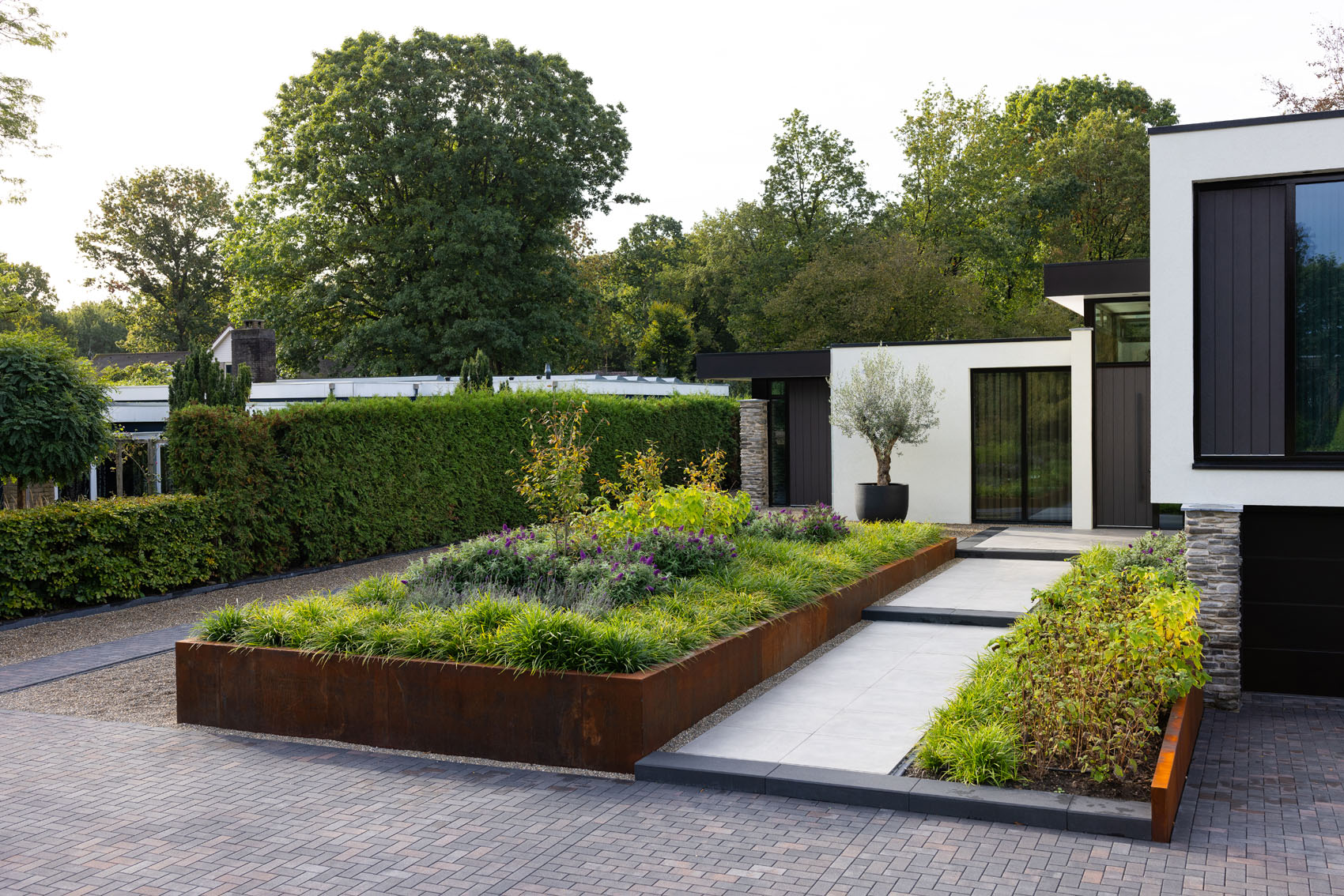 Deze oprit in Veenendaal is een perfect voorbeeld van een harmonieuze, luxe buitenruimte. De strakke witte gevel en het levendige groen worden benadrukt door de GeoSteen® GeoKlinker Plus. Het plaatje wordt helemaal afgemaakt door de Facetto Traptrede die laag met hoog verbindt in de voor- en achtertuin.