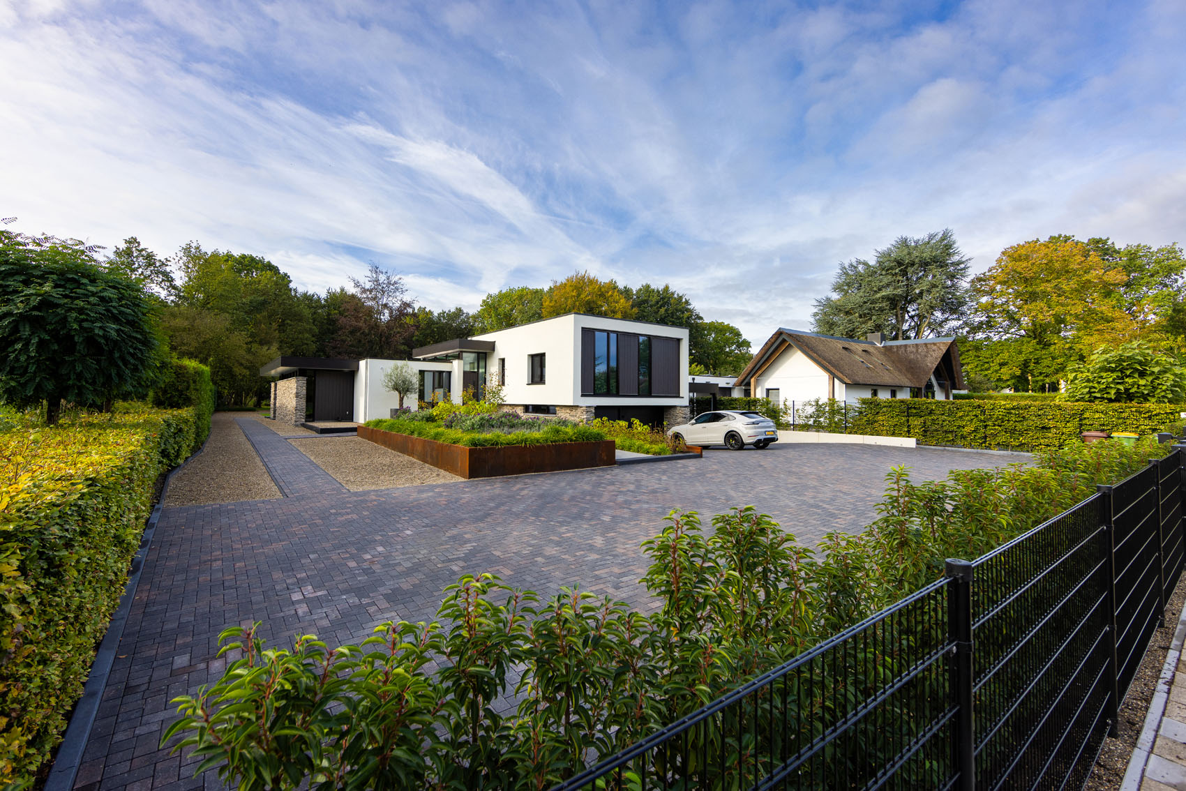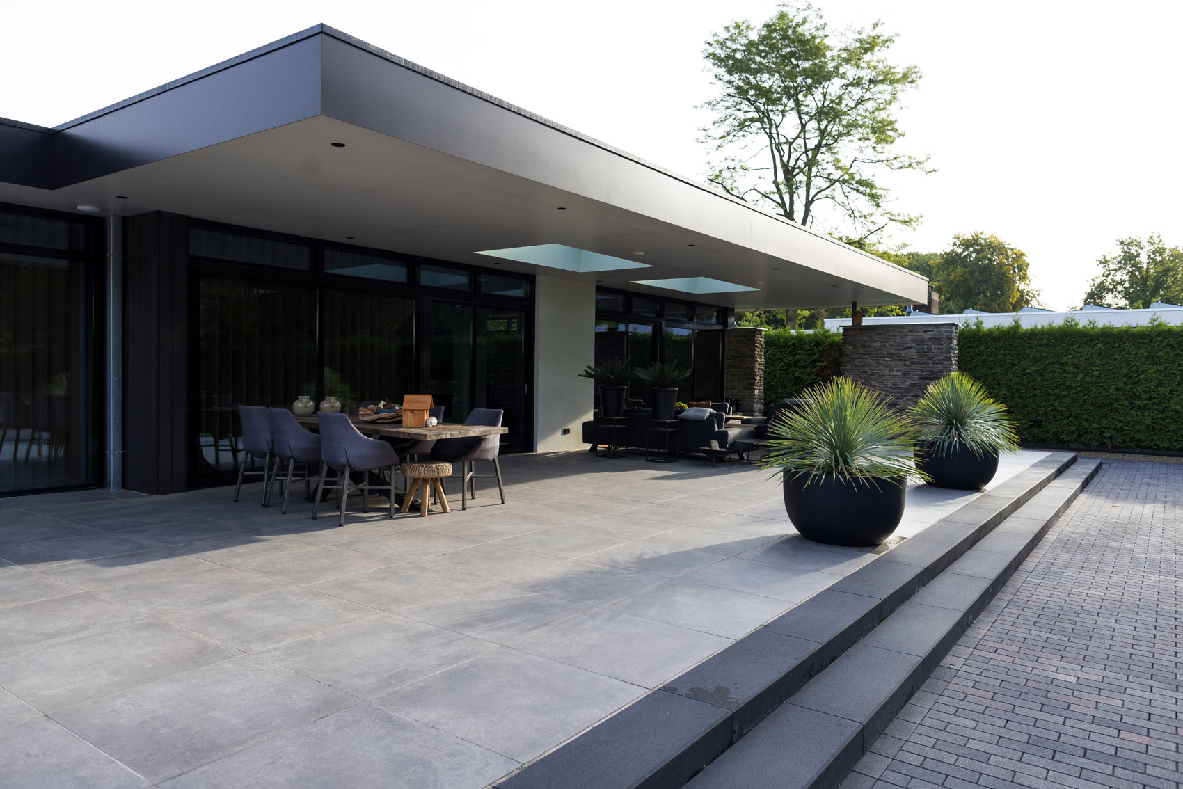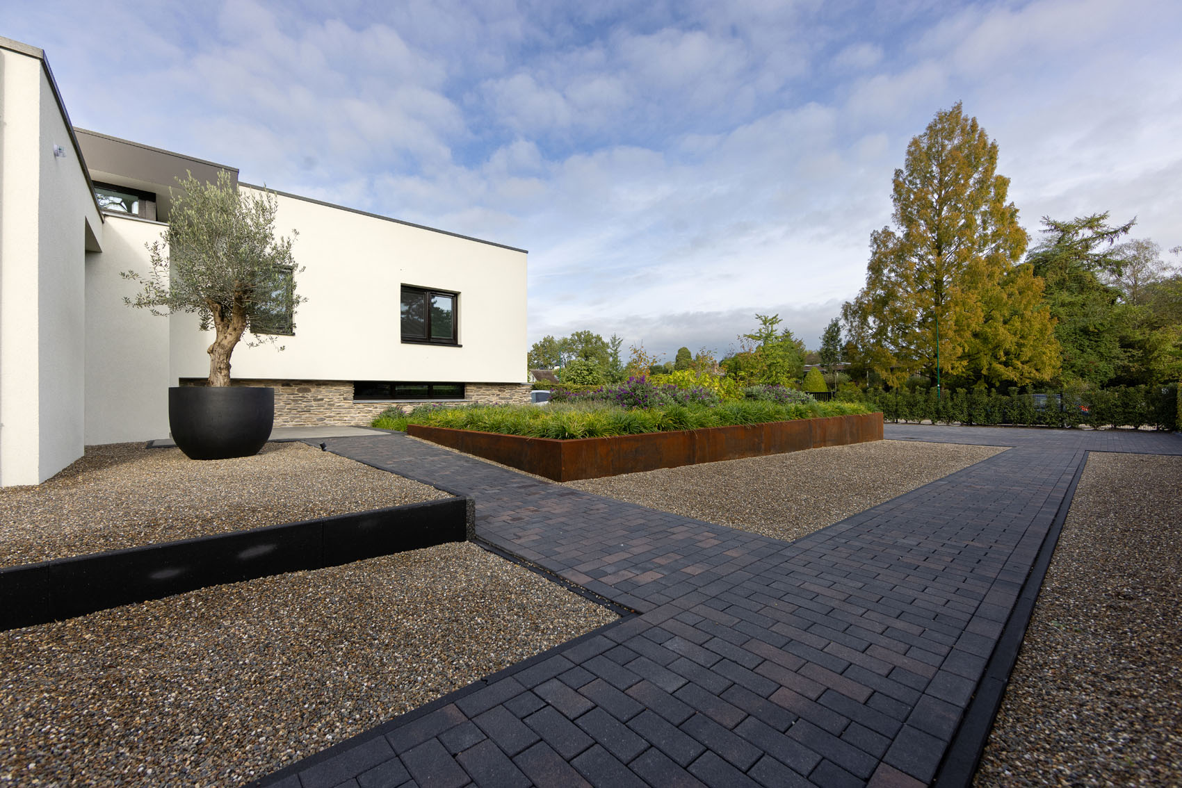 GeoKlinker Plus is beschikbaar in verschillende kleuren en formaten. Hiermee biedt deze handzame klinker een brede range aan mogelijkheden voor elk project. De GeoKlinker Plus is zeer geschikt als tuinsteen en opritsteen, voor dit project zijn de klinkers dan ook als beide ingezet. De ruime oprit brengt je van de weg naar deze luxewoning en biedt volop parkeermogelijkheid. Aan de zijde van het huis vind je een tuinpad dat leidt naar de achtertuin en het terras.