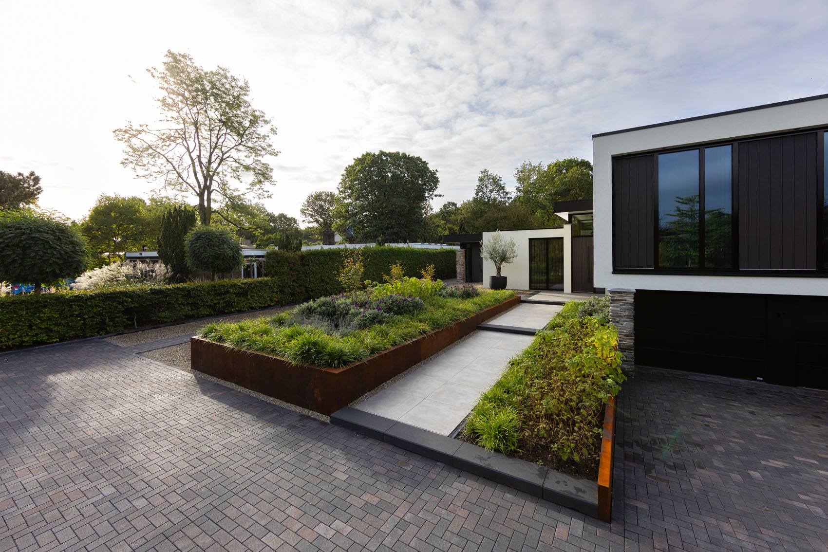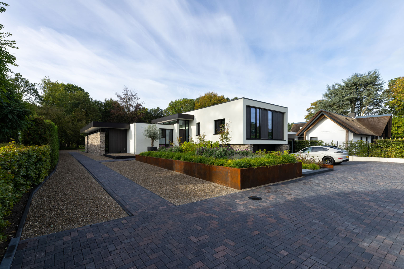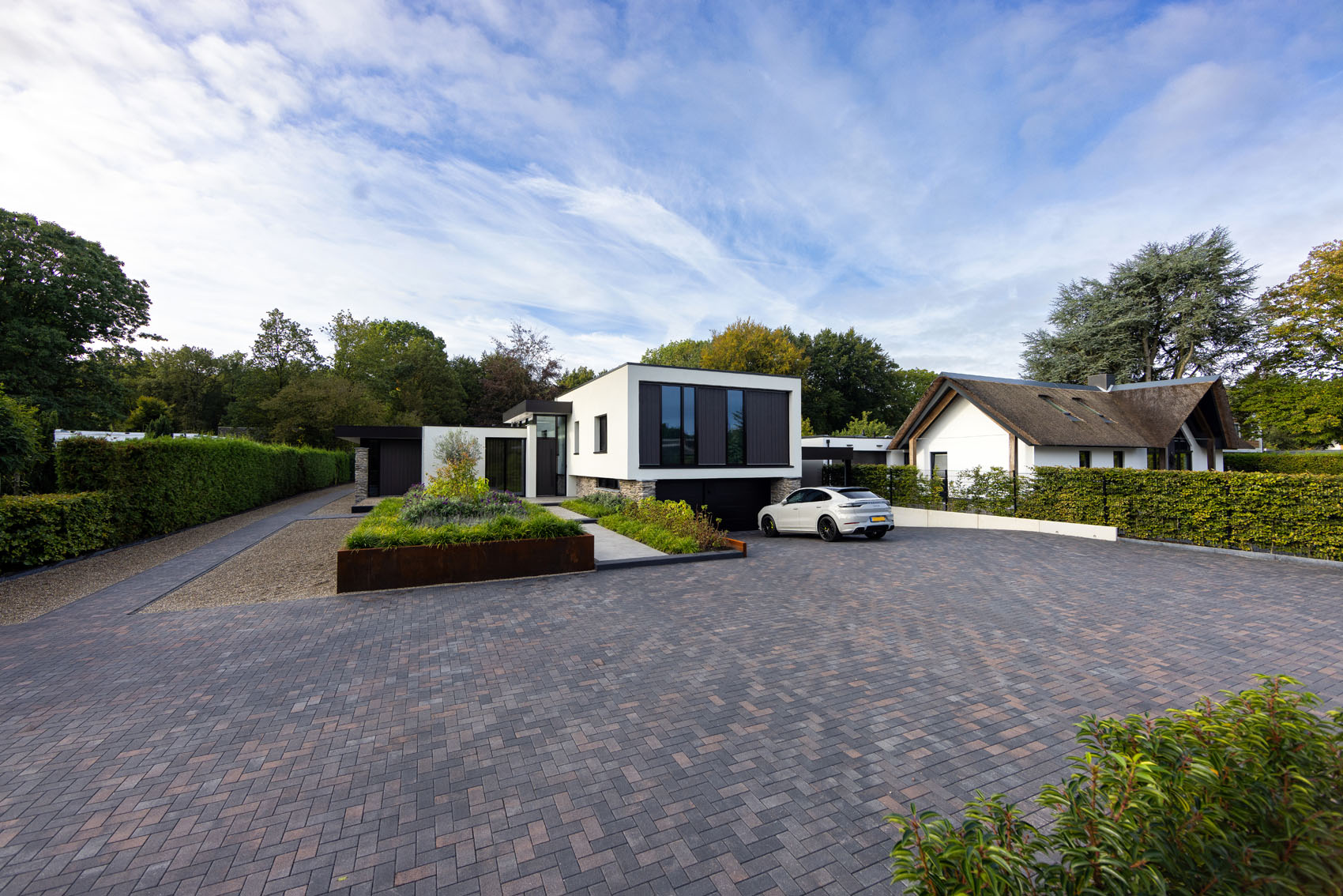 GeoKlinker Plus is beschikbaar in verschillende kleuren en formaten. Hiermee biedt deze handzame klinker een brede range aan mogelijkheden voor elk project. De GeoKlinker Plus is zeer geschikt als tuinsteen en opritsteen, voor dit project zijn de klinkers dan ook als beide ingezet. De ruime oprit brengt je van de weg naar deze luxewoning en biedt volop parkeermogelijkheid. Aan de zijde van het huis vind je een tuinpad dat leidt naar de achtertuin en het terras.