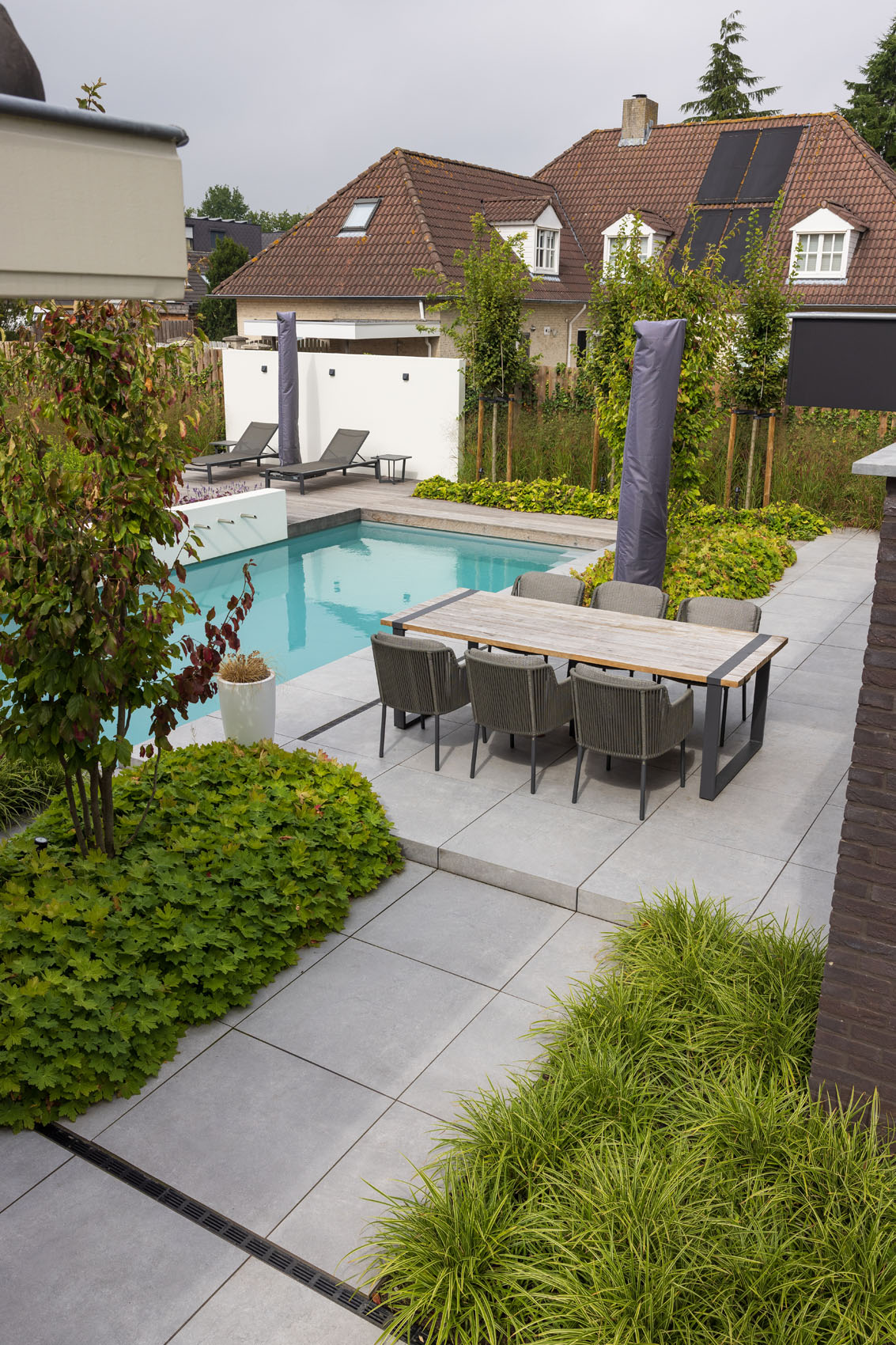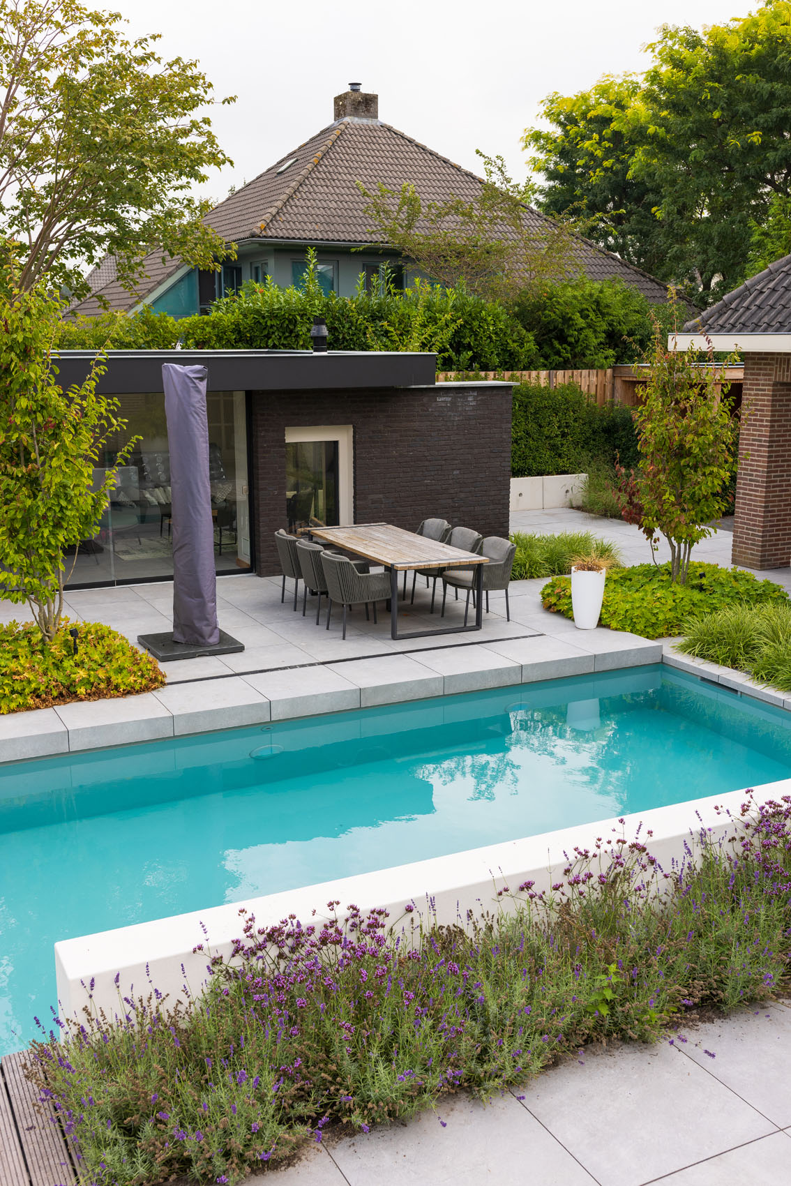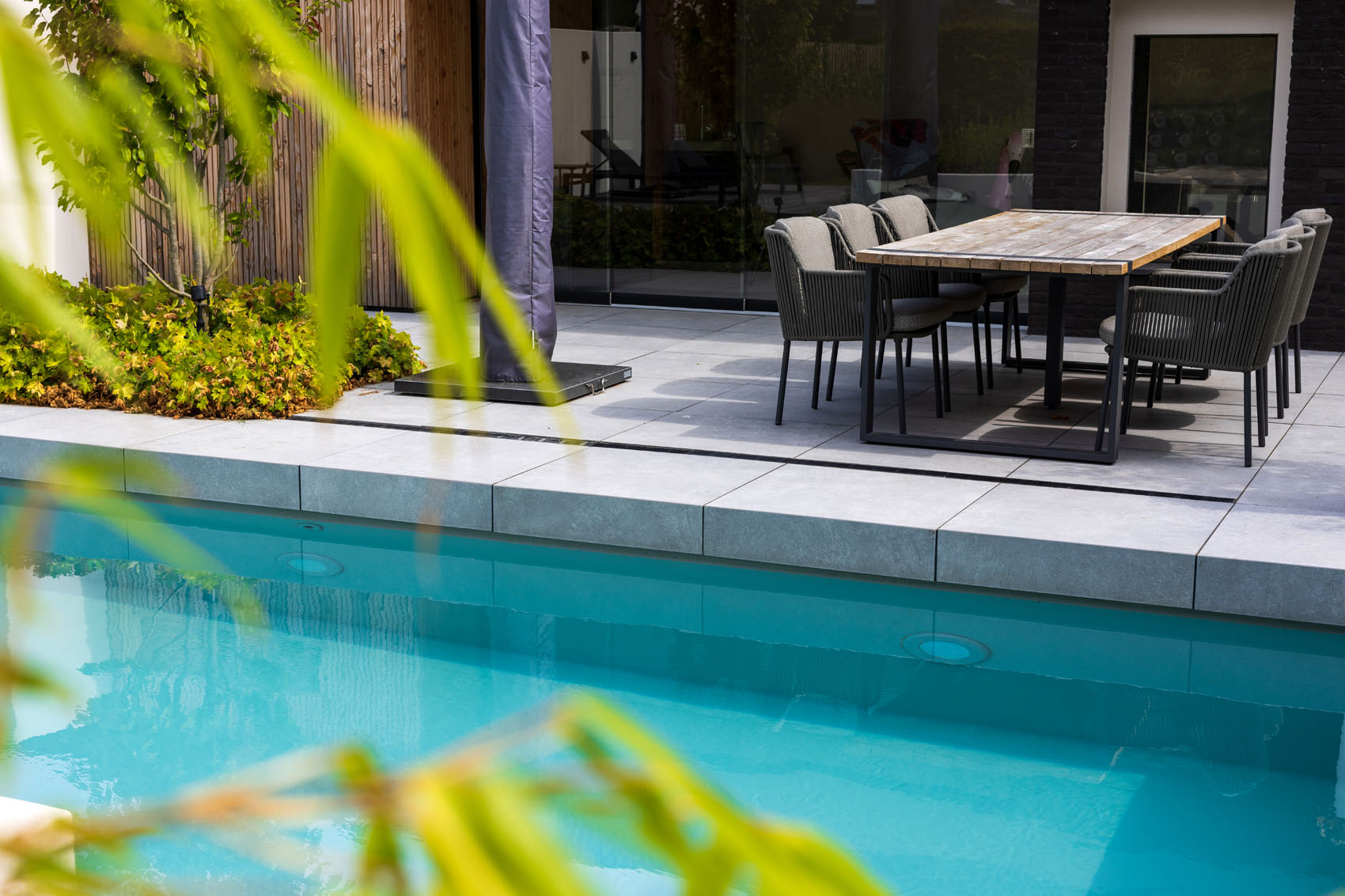 Deze Udense tuin met zwembad en tuinkamer is modern, sfeervol en straalt luxe uit. Dit komt mede doordat dezelfde keramische tuintegels zijn doorgetrokken van binnen naar buiten. Ook de zwembadranden zijn uitgevoerd in dezelfde tegel, waardoor rust en eenheid in de tuin ontstaat.