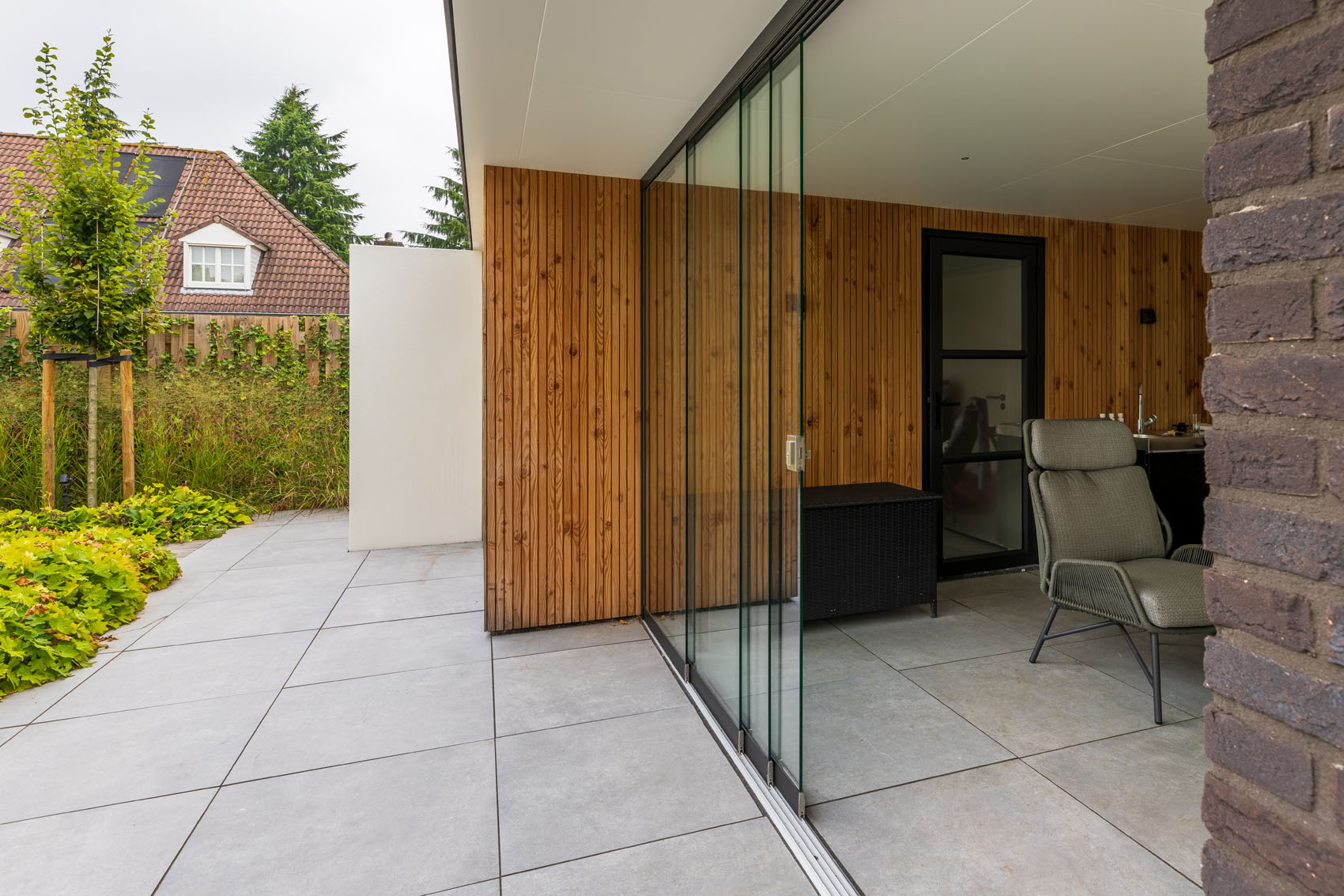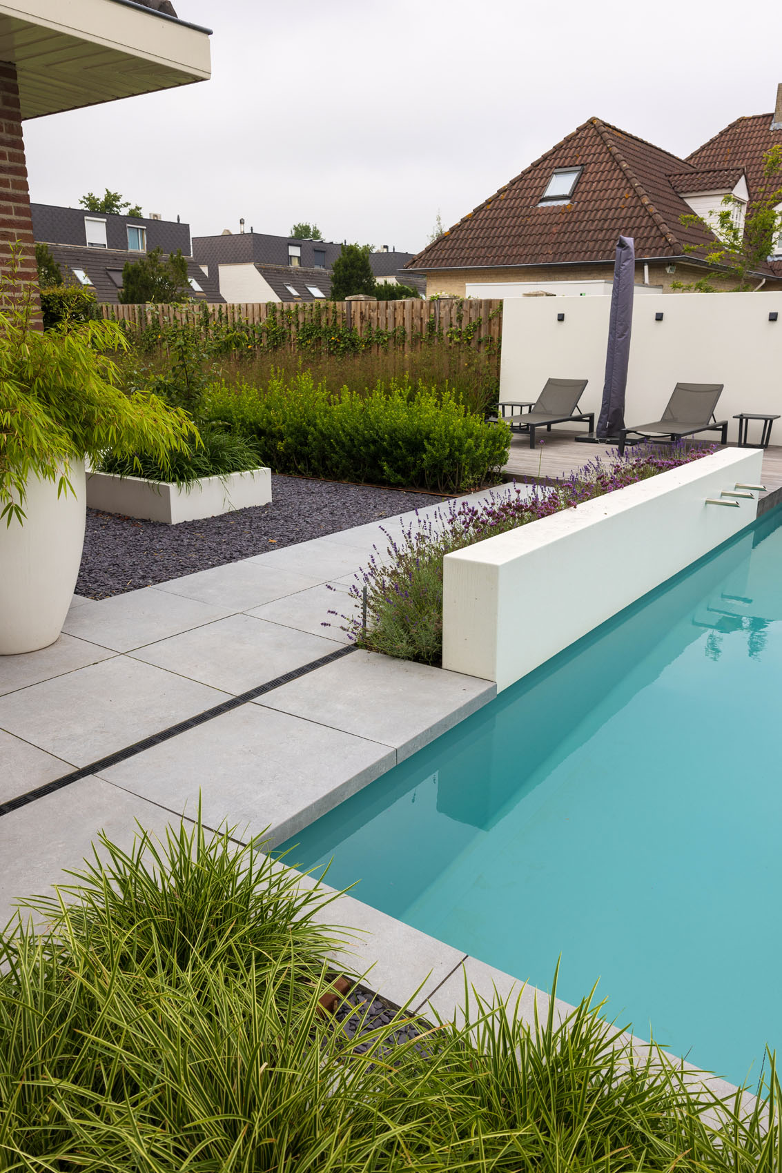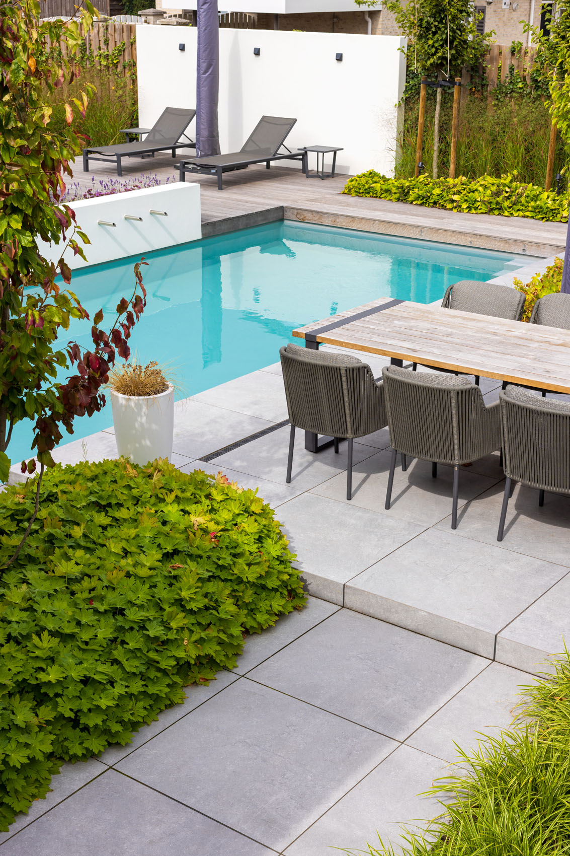 Deze Udense tuin met zwembad en tuinkamer is modern, sfeervol en straalt luxe uit. Dit komt mede doordat dezelfde keramische tuintegels zijn doorgetrokken van binnen naar buiten. Ook de zwembadranden zijn uitgevoerd in dezelfde tegel, waardoor rust en eenheid in de tuin ontstaat.