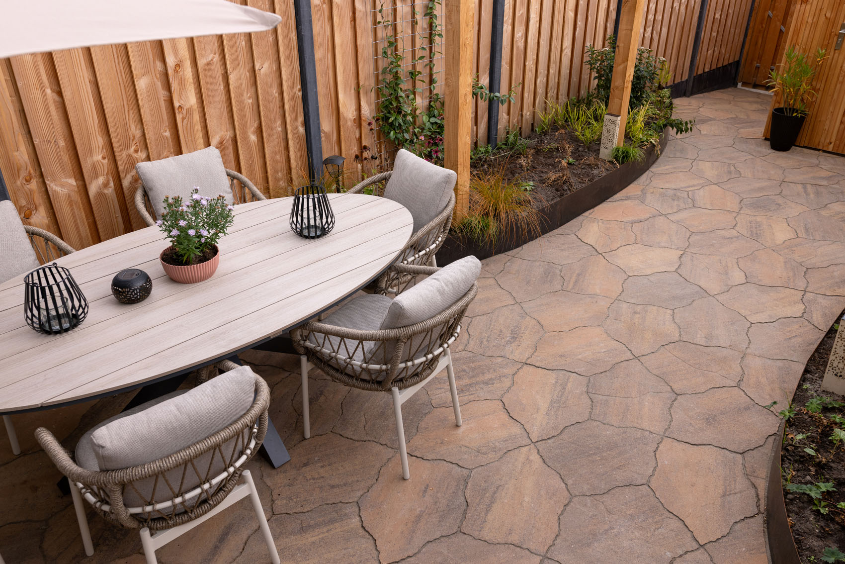 In dit ontwerp speelt de bestrating duidelijk de hoofdrol. De warme tinten en de speelse vormen trekken de aandacht, maar blijven tegelijkertijd in balans met de rest van de tuin. Dankzij het gebruik van natuurlijke materialen en neutrale kleuren in borders en tuinmeubels, komt de GeoArdesia Alivo optimaal tot zijn recht. Zo ontstaat er een tijdloze, romantische buitenruimte die uitnodigt om elk seizoen opnieuw van te genieten.