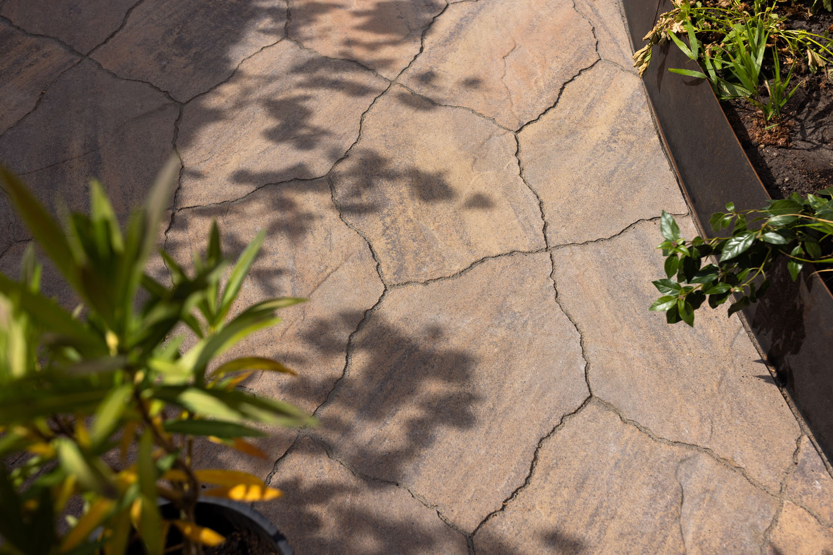 Hoewel de tuin qua oppervlakte bescheiden is, voelt hij toch ruimtelijk aan dankzij de slimme toepassing van de GeoArdesia Alivo. Deze bijzondere siertegel, met zijn vijfhoekige vorm en zachte, organisch gevormde randen, vormt een subtiele en vloeiende overgang van groen naar bestrating. Het resultaat is een natuurlijke en elegante verbinding die het gevoel van de tuin versterkt. Ondanks het unieke voorkomen is de tegel verassend eenvoudig te leggen.