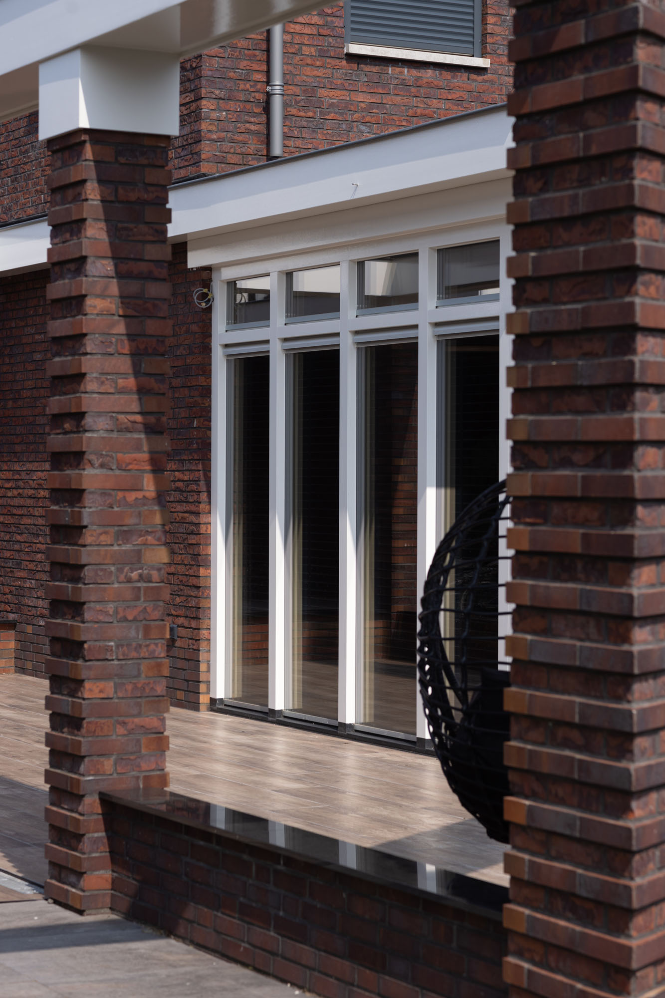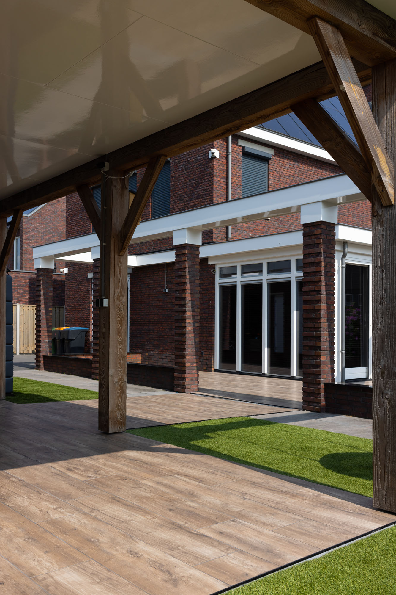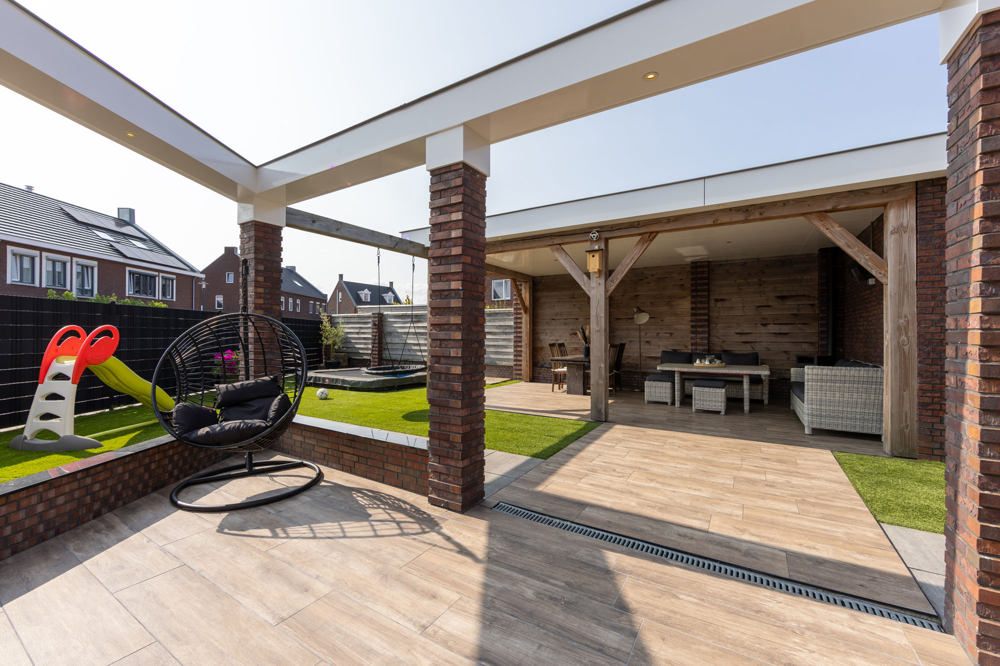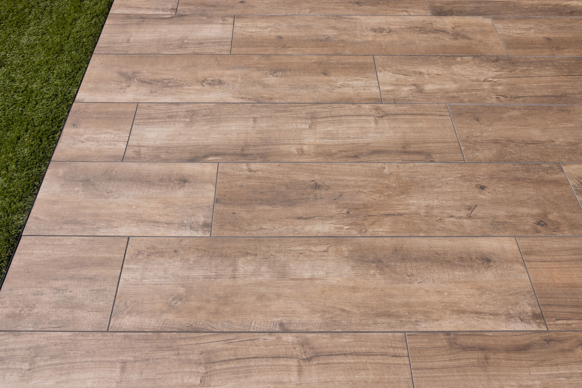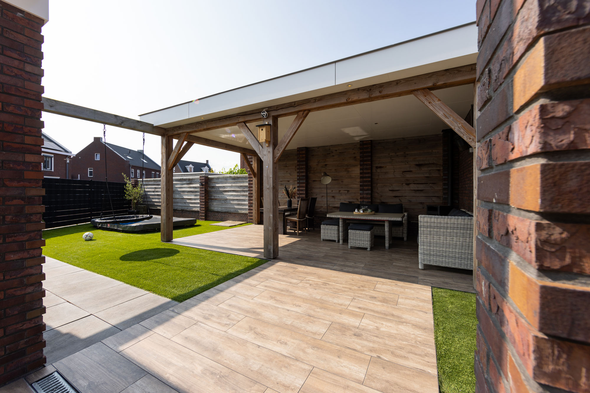 Bij het ontwerp van deze tuin is gedacht aan elk element, waardoor de juiste balans tussen de leefruimtes ontstaat. De lange, houtlook stroken zijn in een halfsteens verband gelegd en creëren zo een speels en dynamisch patroon. De diepe houtstructuur komt mooi naar voren in het zonlicht, alsof je naar echt houten planken kijkt. In combinatie met het kunstgras ontstaat er een strak en groen totaalbeeld. Ook de houten overkapping is afgestemd op de rest van de tuin, waardoor het terras een verlengstuk van de woning wordt. Deze tuin is het perfecte voorbeeld van hoe je een moderne en natuurlijke buitenruimte creëert met keramiek en slimme materialen.