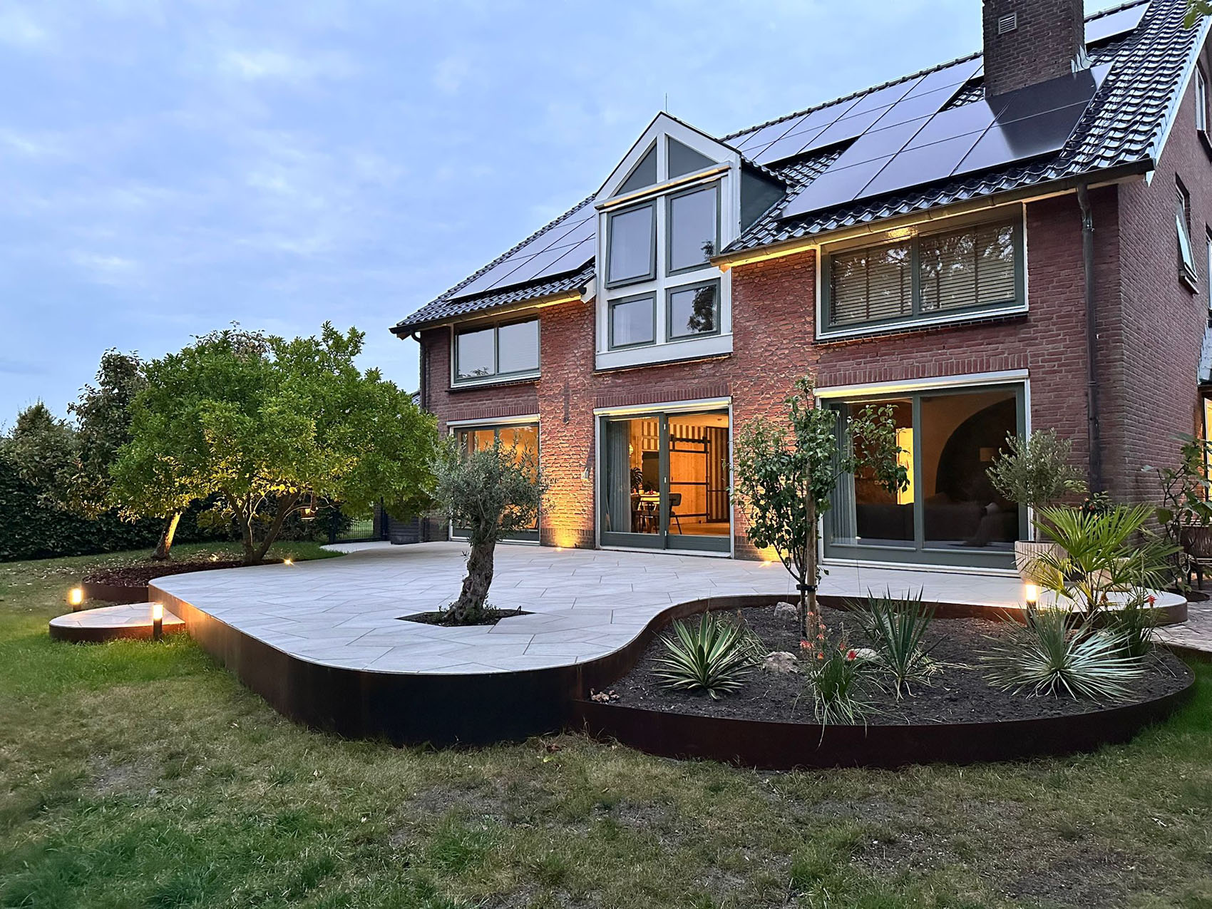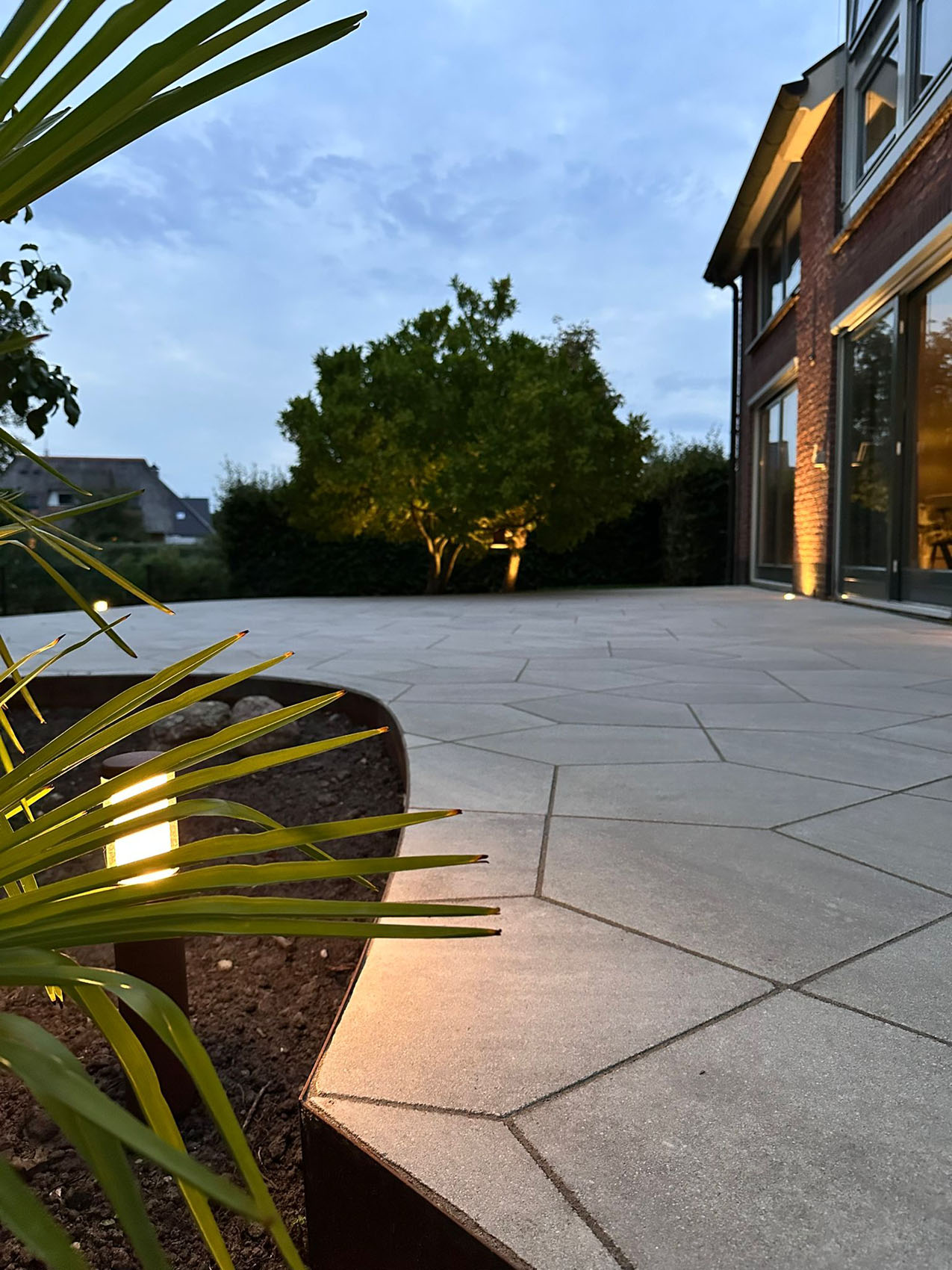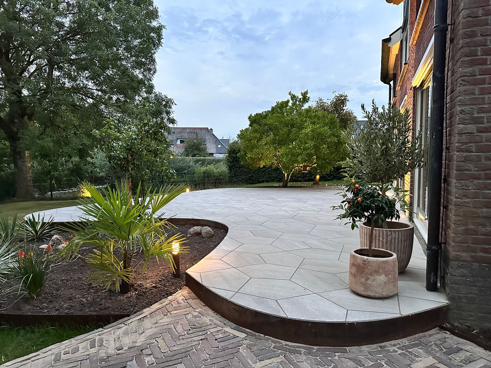 De basis van het ontwerp wordt gevormd door de GeoStretto Alivo in de kleur Lazise. Deze betontegel heeft een verfijnde uitstraling en brengt structuur in het geheel. De vijfhoekige vorm geeft een subtiel speels effect zonder af te doen aan het strakke lijnenspel. In combinatie met de golvende cortenstaal randen ontstaat er een contrast tussen geometrie en organische vormen, een samenspel dat het terras een uniek en dynamisch karakter geeft.