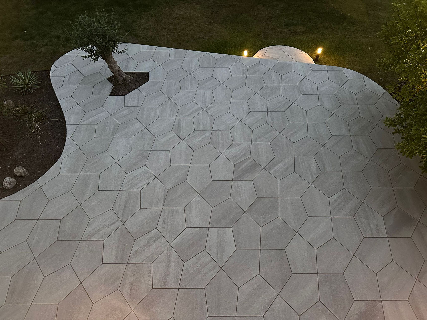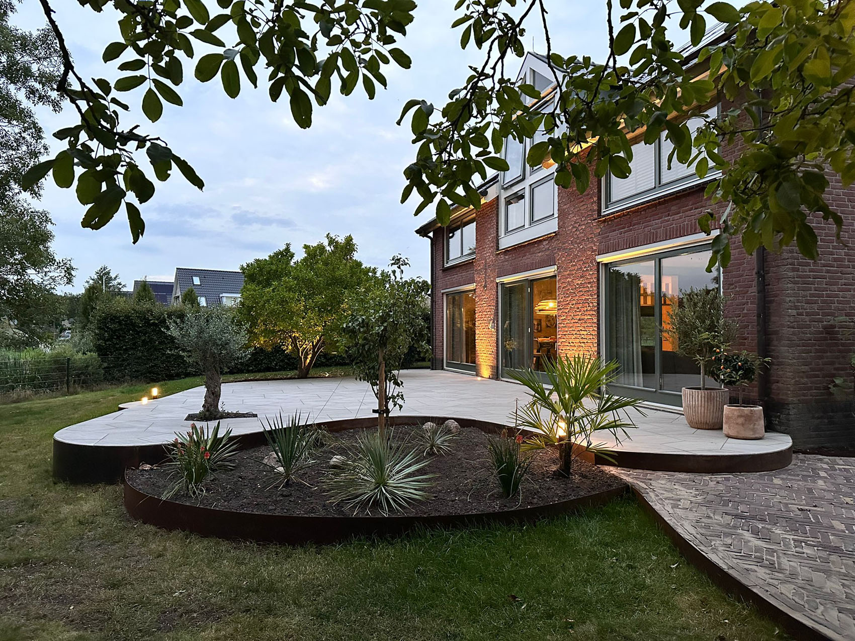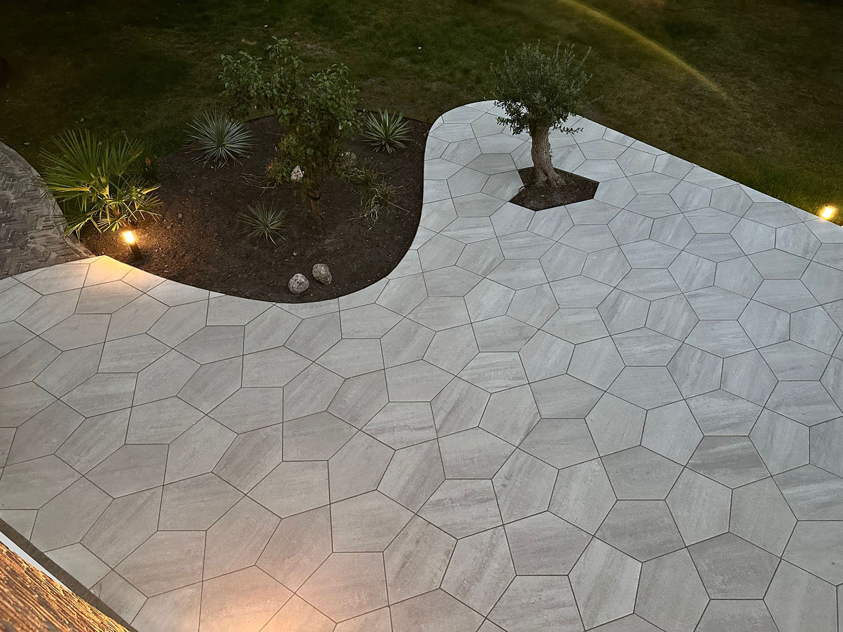 De basis van het ontwerp wordt gevormd door de GeoStretto Alivo in de kleur Lazise. Deze betontegel heeft een verfijnde uitstraling en brengt structuur in het geheel. De vijfhoekige vorm geeft een subtiel speels effect zonder af te doen aan het strakke lijnenspel. In combinatie met de golvende cortenstaal randen ontstaat er een contrast tussen geometrie en organische vormen, een samenspel dat het terras een uniek en dynamisch karakter geeft.